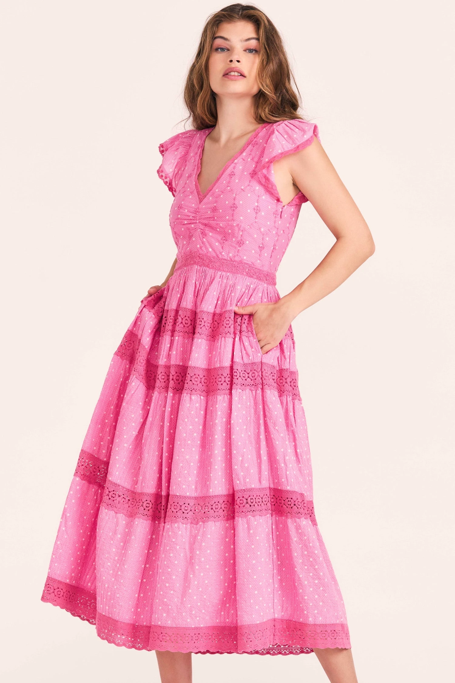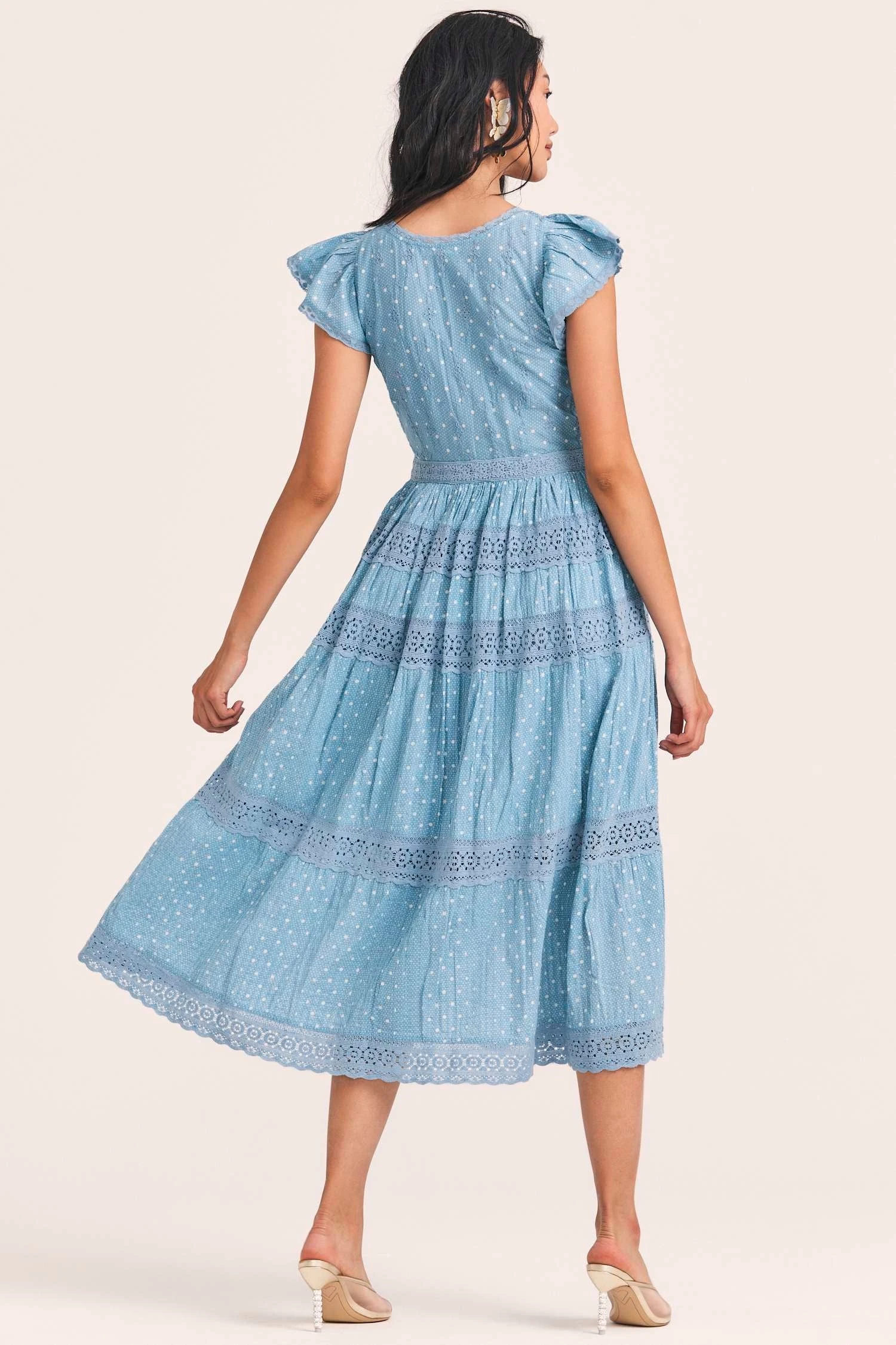 Our new Abena Dress is a sophisticated staple in cotton voile with polkadot pattern play, schiffli embroidery and a mix of custom embroidered and crocheted laces. This easy midi has a v-neck, gathering at center bust, flutter sleeves and a fixed waist. The shirred skirt, with side-seam pockets, falls to alternating lace and pintucked panels for a stripe effect. Accessorize it with our LSF x Lele Sadoughi Knotted Headband.