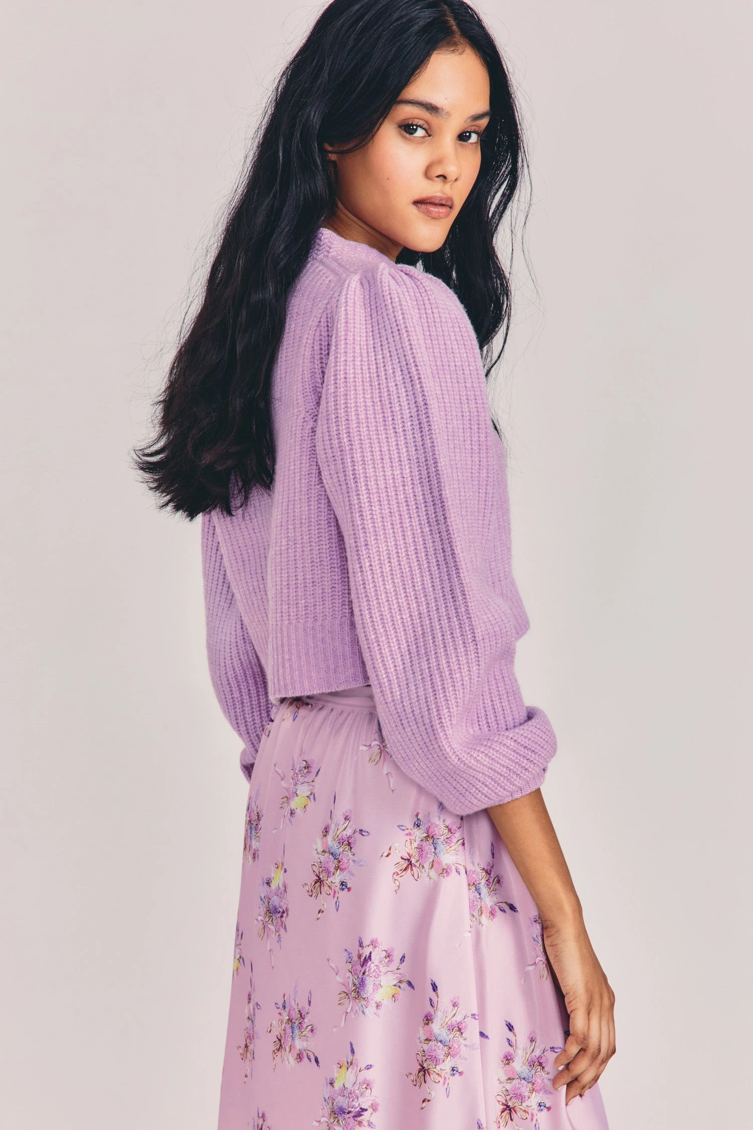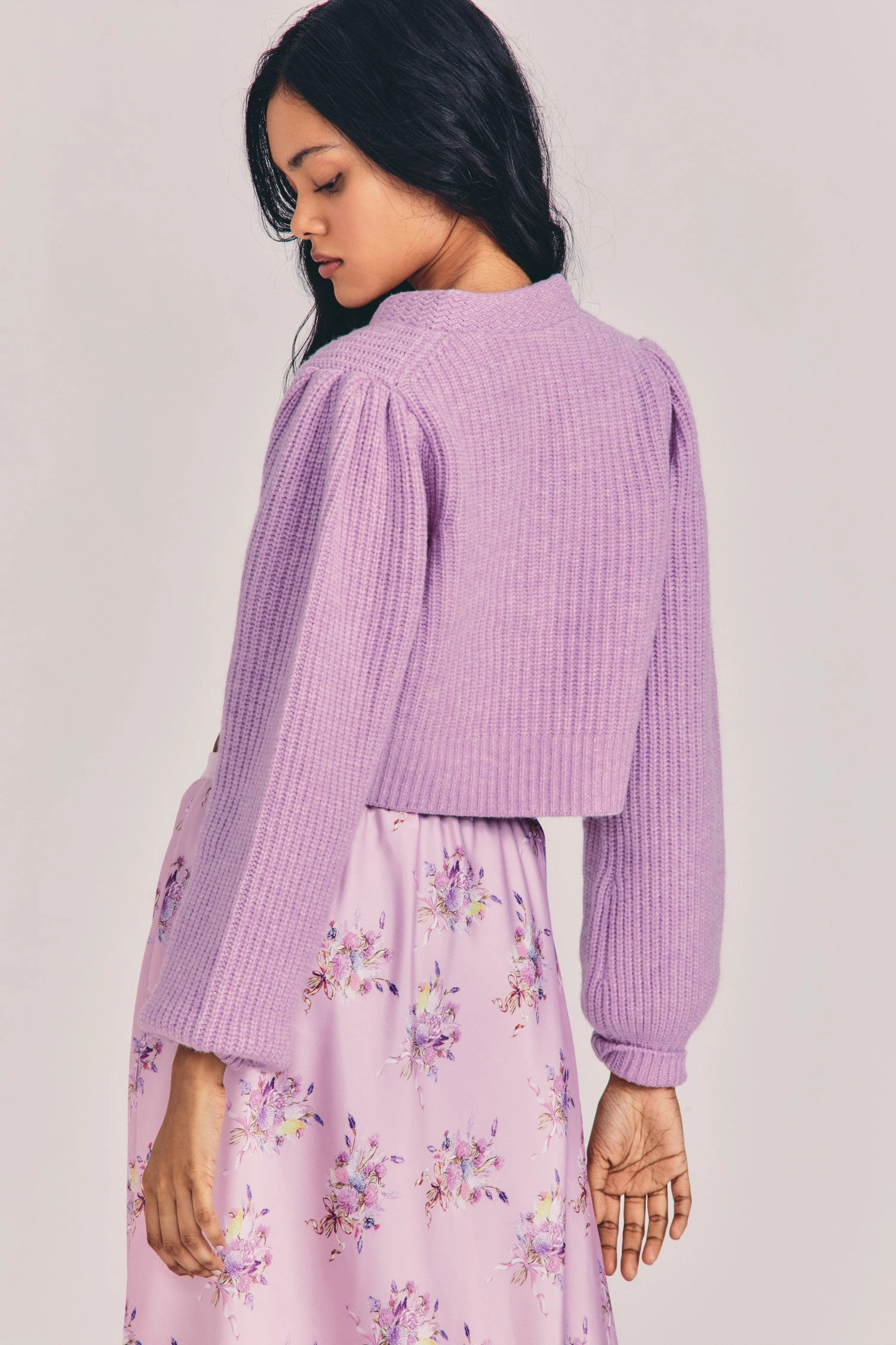 A signature favorite, our Avignon Cardigan is back in a cashmere-wool blend with intricate knit techniques. This cropped sweater, at once cozy and cute, has a v-neck that descends to three flower buttons at center front. Pleated blouson sleeves extend to ribbed cuffs at opening (mirrored at the bottom). Pair it with our Dornie Mini Skirt.