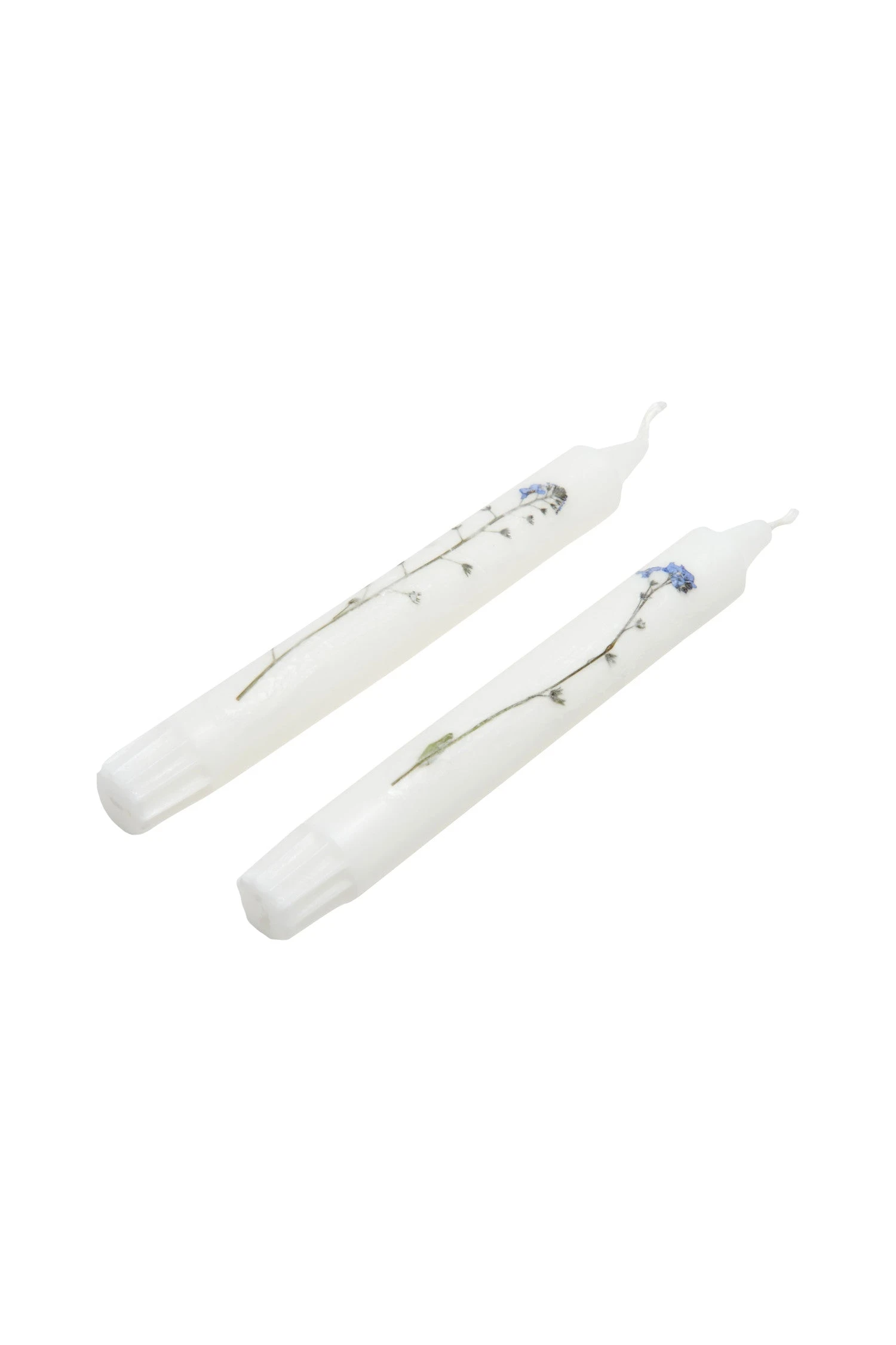 Set the mood with this pair of blue wildflower candlestick by Croak and Bloom. Each candle is hand-picked and sustainably harvested in Washington. These hand-pressed candles are adorned with real seasonal pressed flowers. Each is unscented and made using stearin wax, which creates the lowest CO2 emissions of all wax. Shown here in Blue.