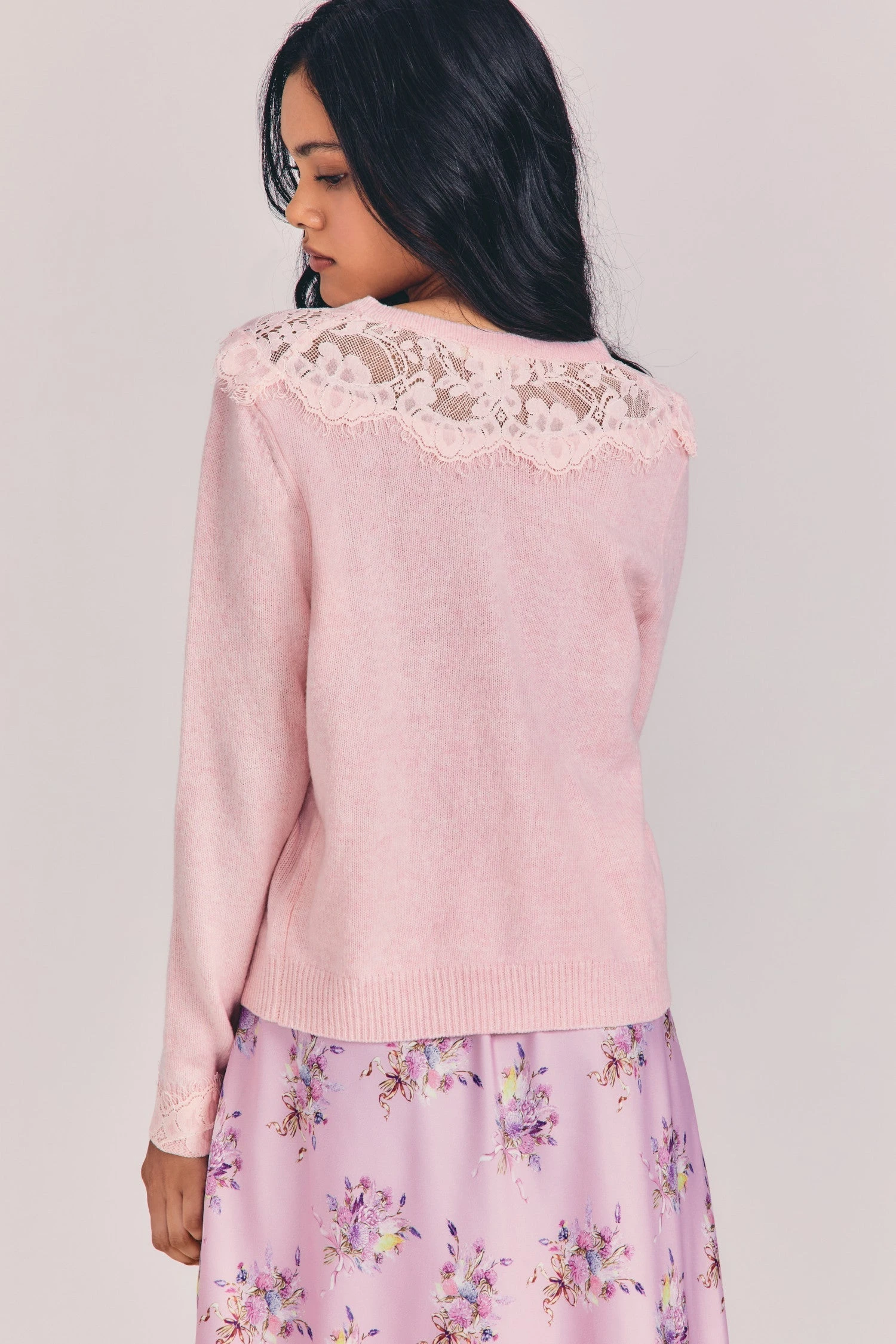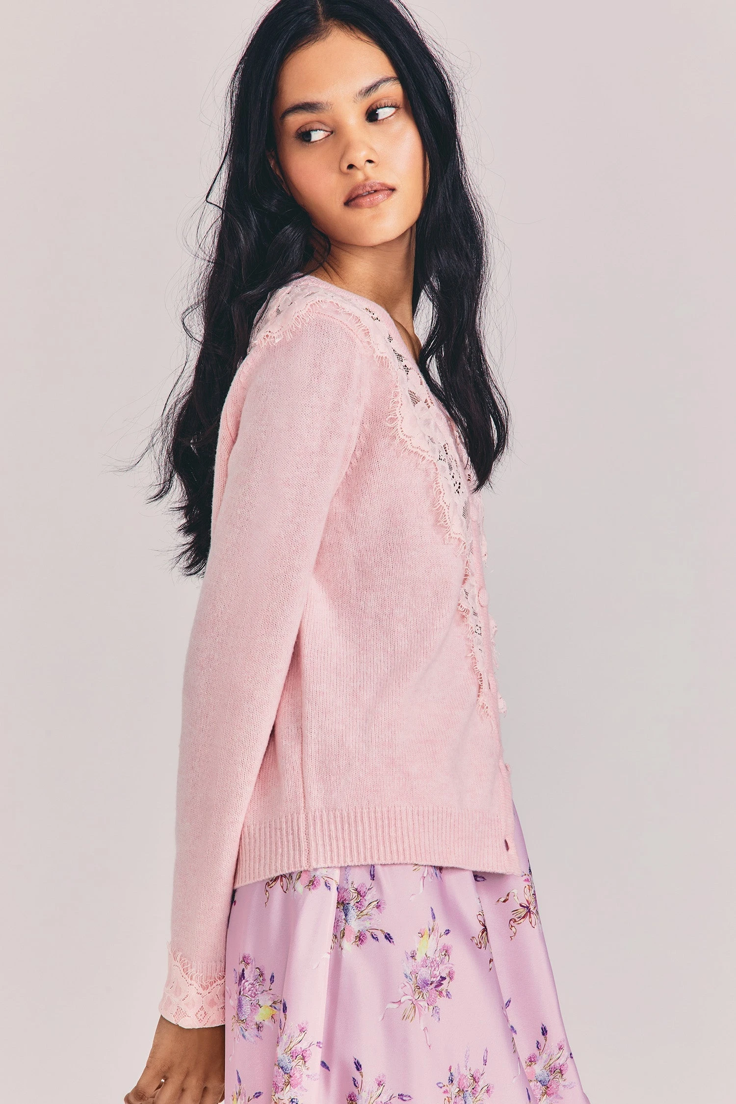 Our Brandie Cardigan has a vintage vibe in a soft merino wool and cotton blend with large custom floral lace details with raw edges. This pretty sweater has covered buttons down center front, slim long sleeves with top-applied lace at opening and a ribbed border at bottom. Wear it with our Aimee Skirt.