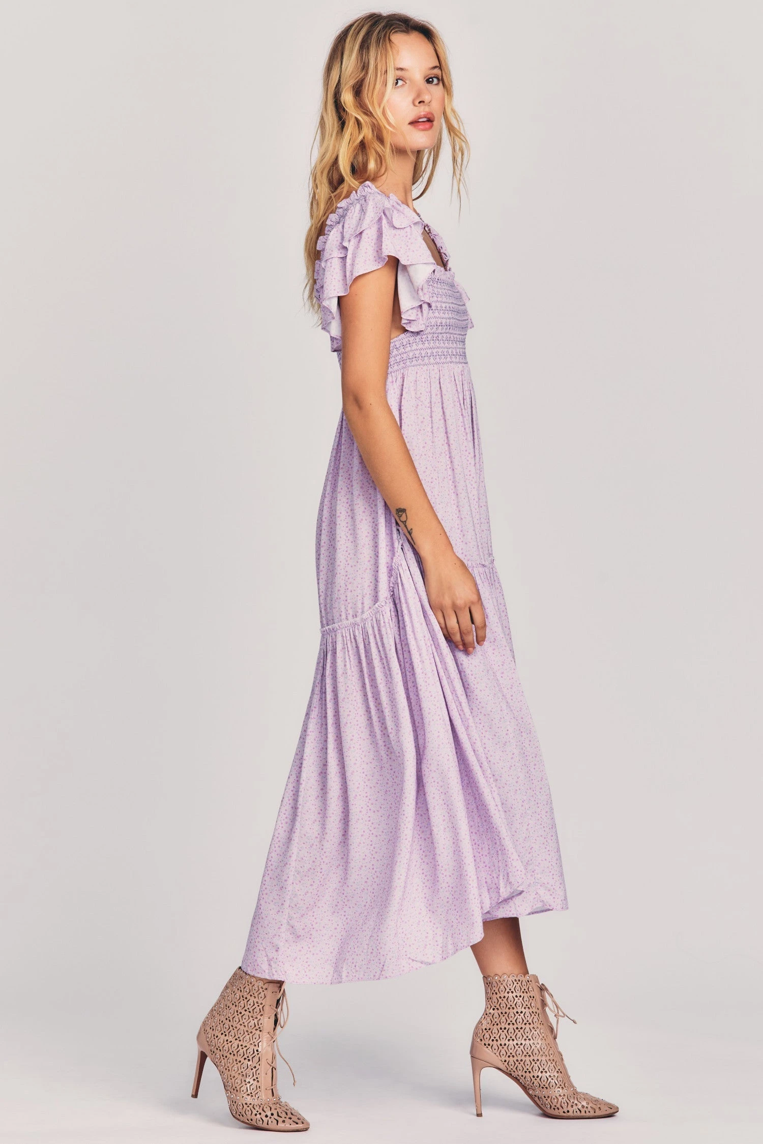 Freedom is our Burnley Dress in rayon with a ditsy floral print. This update to our bestselling Constantine has a square neckline, which can be worn on- or -off-the-shoulder, framed by double flutter sleeves. The bodice features contrast smocking to an empire waist, then falls effortlessly, with side-seam pockets, to a single elongated flounce at bottom. Pair it with our Brookie Cardigan.
