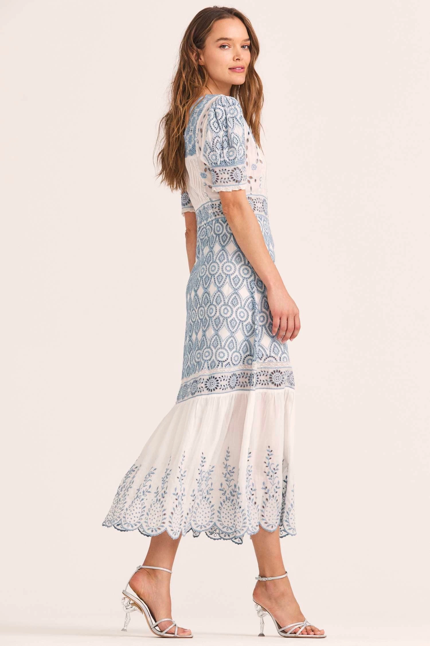 Our new Helena Dress is a work of art in our soft modal with an elaborate mix of all-over contrast eyelet embroidery. This ankle-length frock features a subtly scalloped neckline, a hidden button placket down center front, puffed short sleeves with ruffle trim, elastic at center back waistband and a scalloped bottom hem. Pair it with our Keoni Cardigan Sweater. Shown here Ivory Shores.