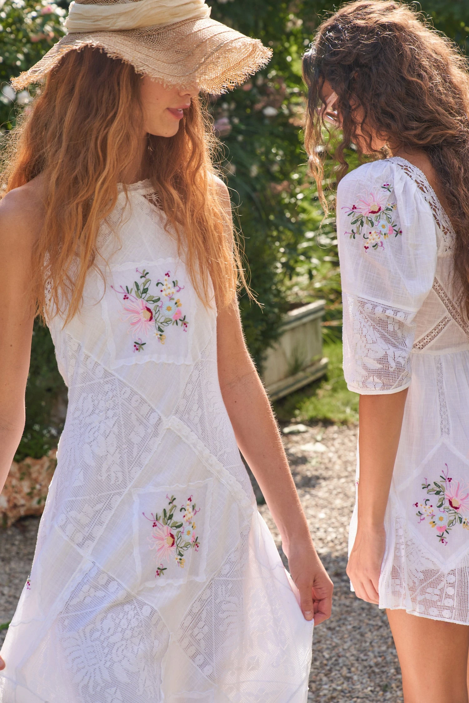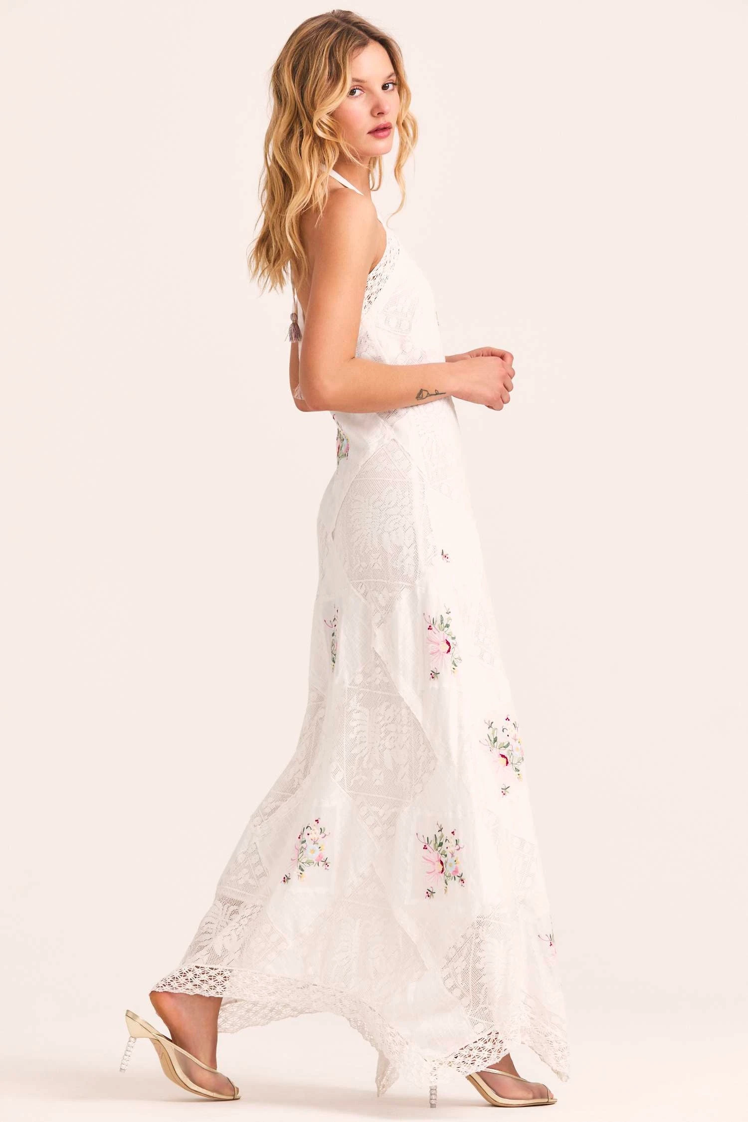 Our Kamia Dress raises the bar in 100% cotton with geometric panels of mixed vintage-inspired lace techniques and multicolored floral hand-embroidery. This elevated halter dress, perfect for champagne nights, ties behind the neck above sheer lace panels. Below, the dress skims the body, draping effortlessly to the ankle. Accessorize it with our LSF x Lele Sadoughi Pearl Headband. Shown here in Antique White.
