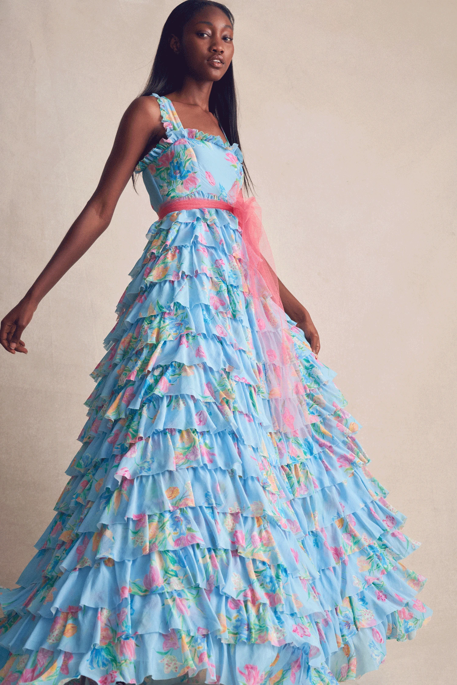 Our Idra Dress makes an entrance in textured chiffon with a watercolor floral print. This festive gown has ruffle-trimmed straps and ruffles along the bust line, a fitted bodice with princess seaming and a multitiered skirt that falls to the ankle. Shown here in Sky Lullaby.