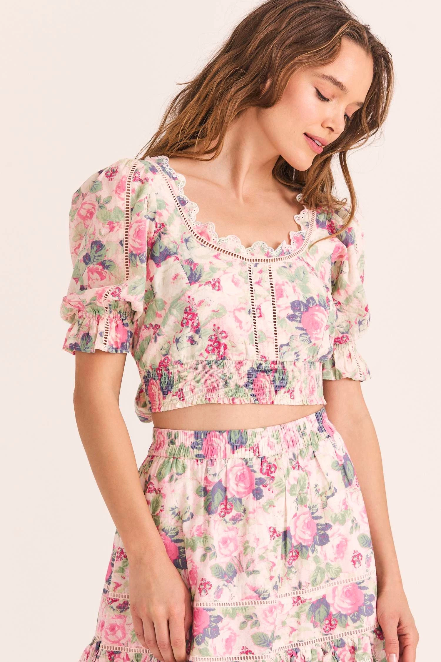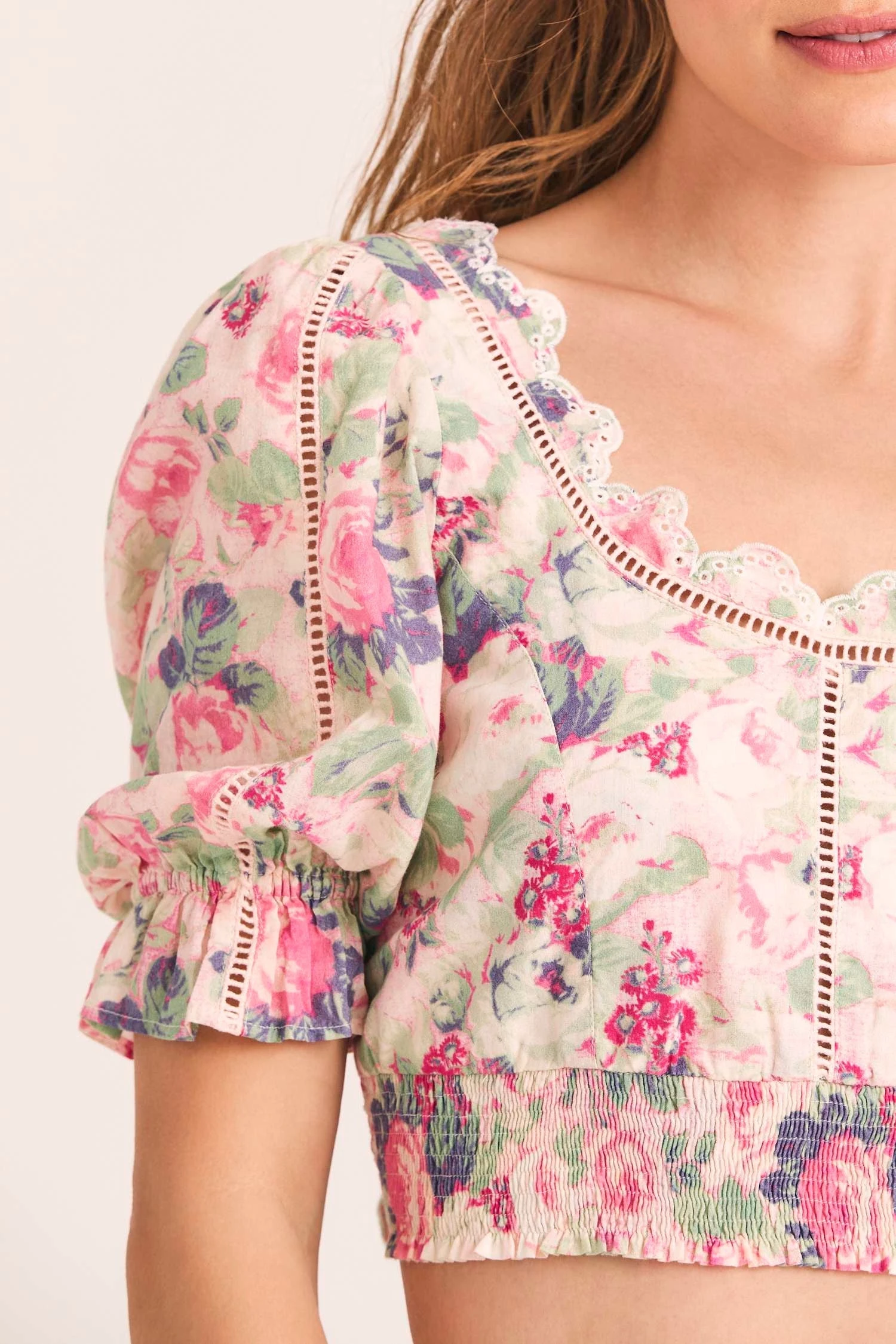 Our Karsten Crop Top has a little something extra in 100% cotton with our hero hand-painted rose print of the season, inset embroidery and eyelet detailing. This Victorian-inspired top has a shaped scoop neck, puffed sleeves with elastic and a ruffle at opening and a smocked bottom panel. At back, it dips to a deep v and ties with an oversized bow. Wear it as a set with our Pernille Mini Skirt.