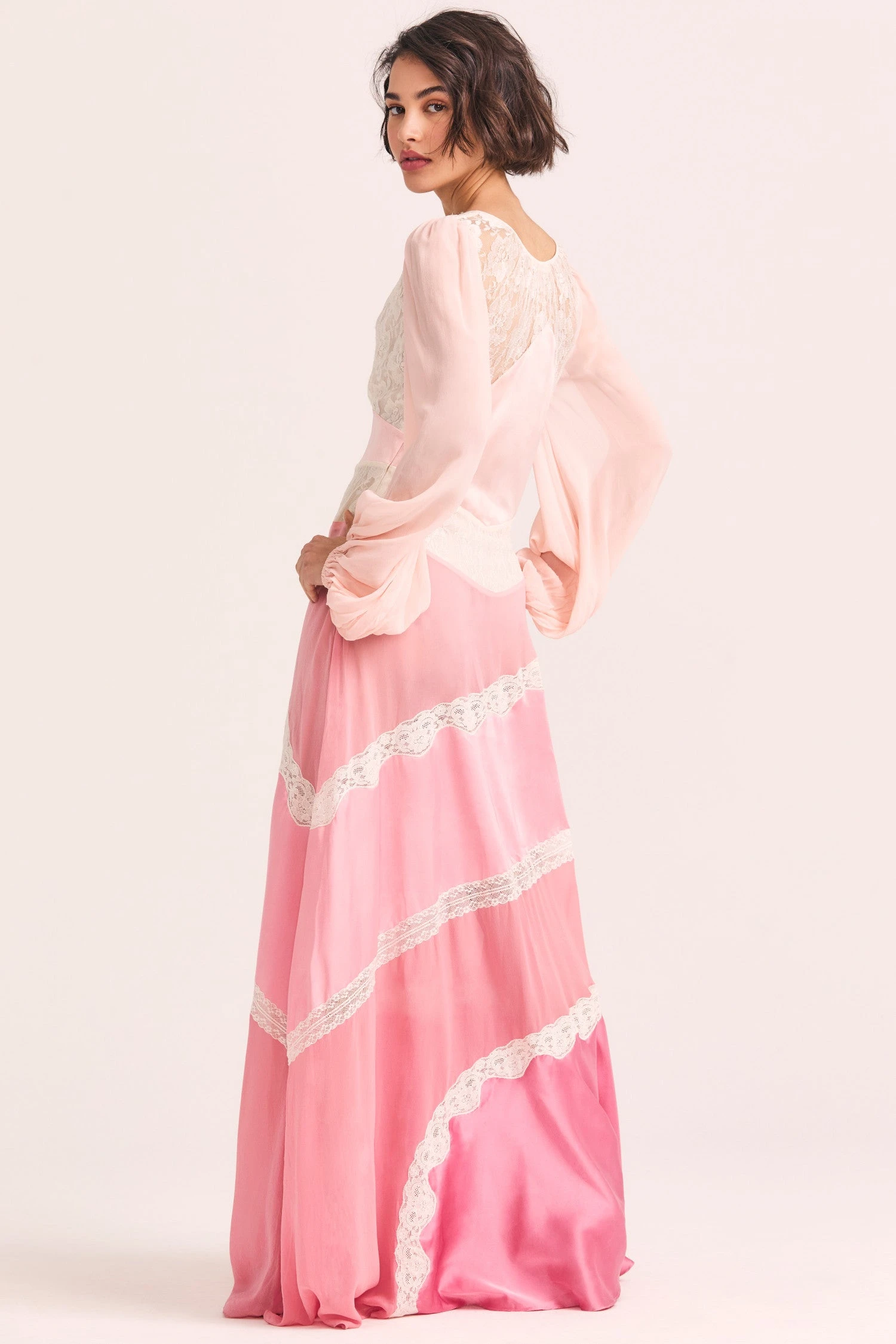 Our new Kinsler Dress is a showstopper in color-blocked shades of pink with mixed custom lace details. This romantic gown’s v-neck plunges to functional buttons at the corseted waistband. Generous long puffed sleeves are shirred with encased elastic at opening. Below a v-shaped seam, the full sweep skirt features alternating diagonal lace panels. Shown here in Pastel Pink Colorblock.