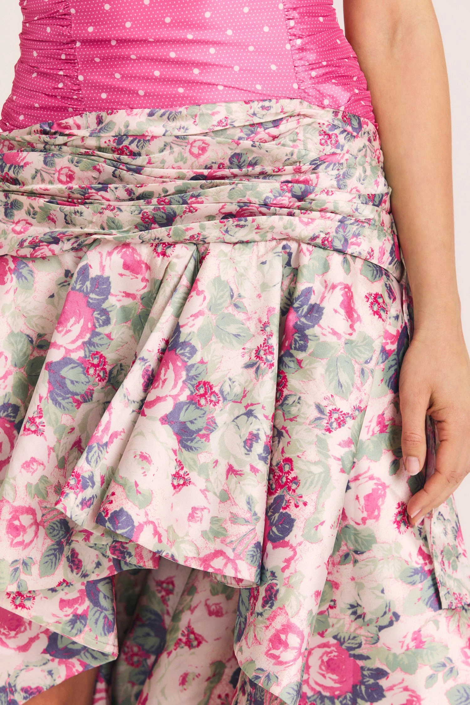 Our new Leilani Dress makes a statement in a taffeta print mix of scaled polkadots and this season’s rose hero print. It’s a party in the front and the back with its heart-shaped strapless neckline, shirred bust and side body, exaggerated rosette detail at center front, large bow at center back and a full sweep, high-low skirt with a mesh inner lining for shape. Shown here in Fuchsia Flower Dot.