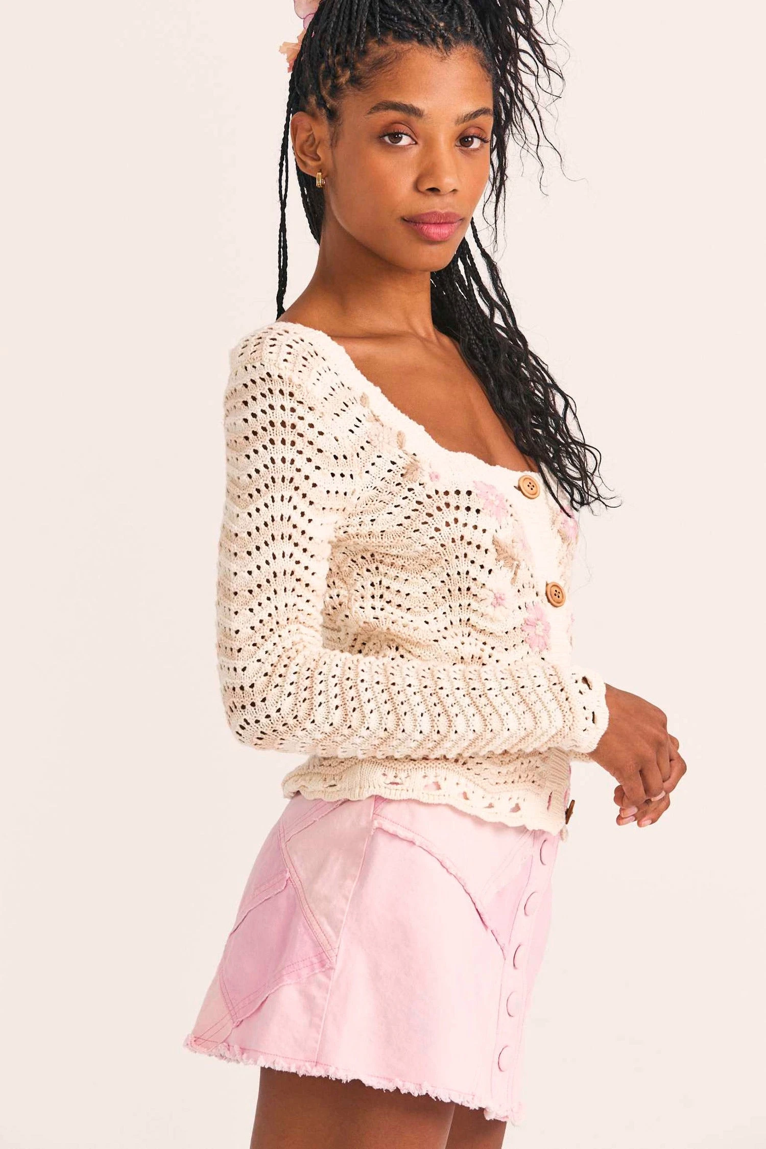 A perfect transitional piece, our Leonel Cardigan arrives in 100% cotton with striped chevron stitching and hand-embroidered flower details. This beautiful lightweight sweater has a scallop-edged square neck, a ribbed placket and wooden buttons down center front. Pair it with our Cayde Mini Skirt. Shown here in Ivory.