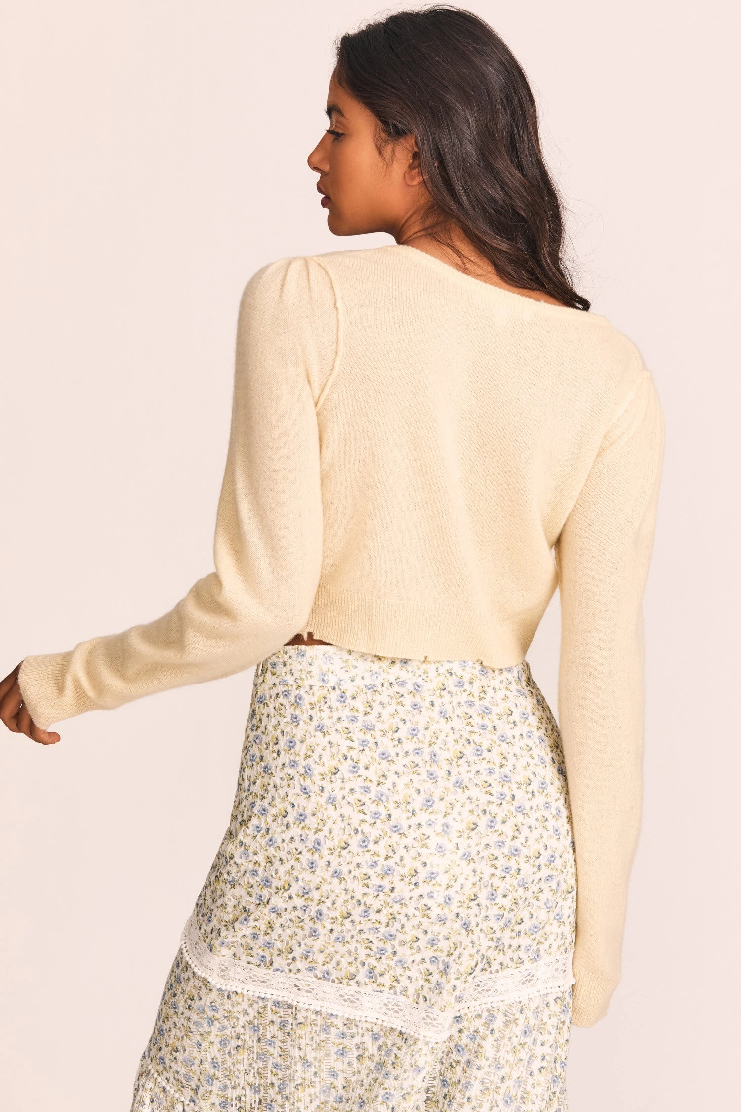 Our Lune Cropped Pullover is back by popular demand in a wool-cashmere knit with distressed trim. This fitted sweater is both edgy and sweet, from its ribbed scoop neck to its shirred sleeves and cropped bodice. Pair this with our Sisto Midi Skirt. Shown here in Daffodil.