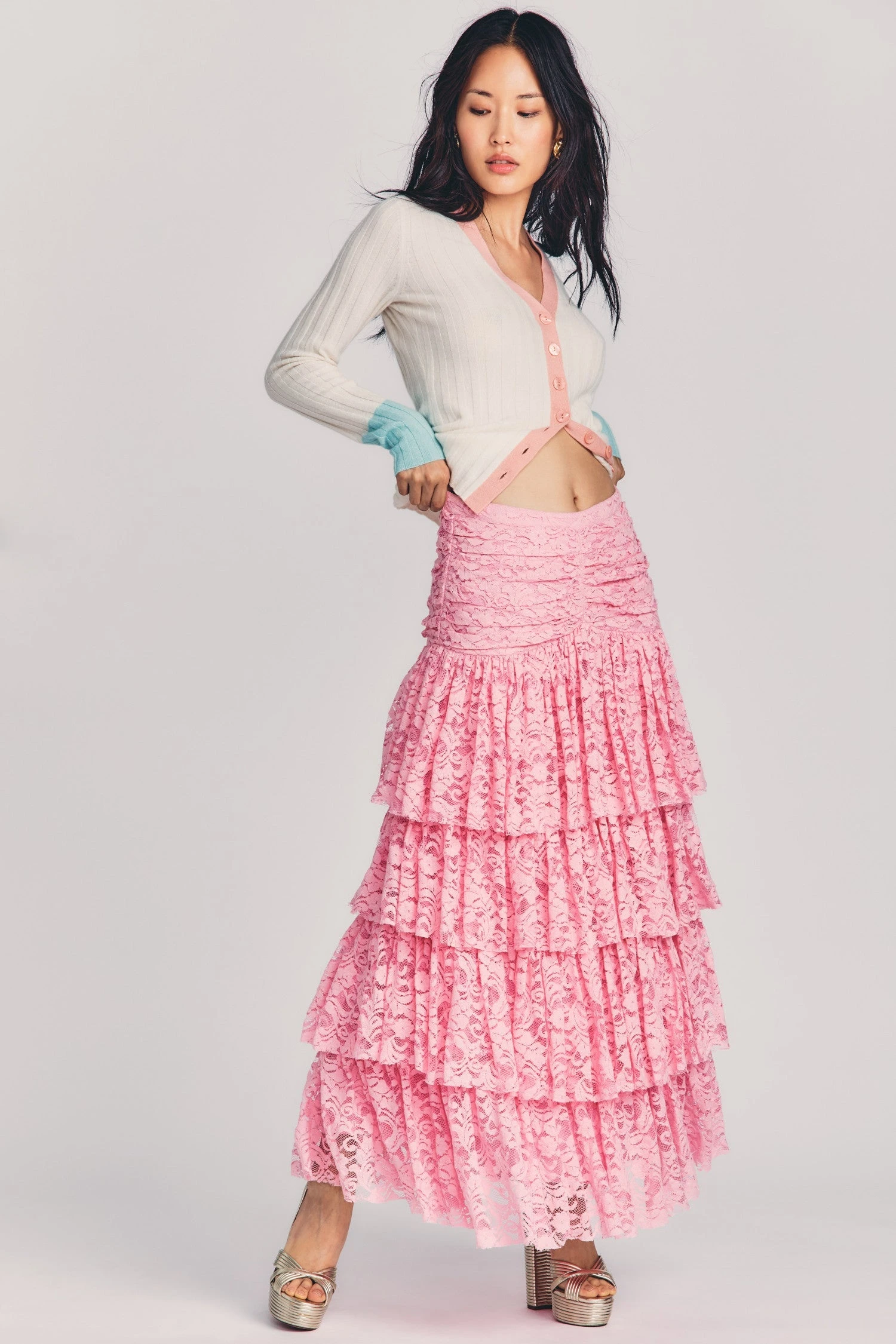 Our new Marsala Skirt is pretty in pink in custom floral lace. Below a fixed waist, the fitted top panel is ruched with a seam at center. The skirt falls to overlapping tiers with raw edges. Pair it with our McKinley Cardigan or Brookie Cardigan.