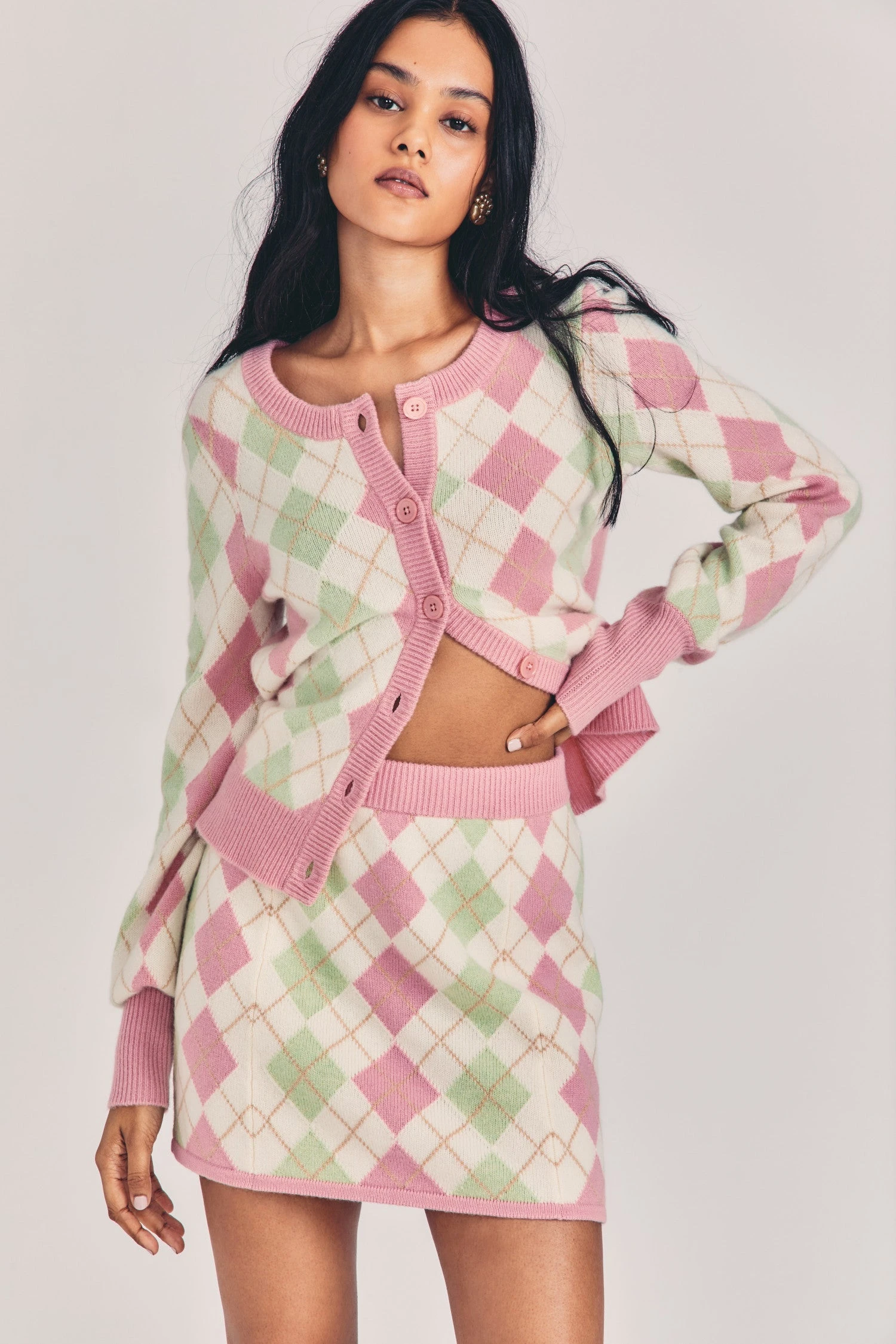 Our Marseille Skirt keeps it simple in a cashmere-wool blend with our new signature argyle motif. This cozy mini is short and sweet with a ribbed elastic waistband, subtle princess seams and a slim fit. Make it the perfect set with our Glinda Pullover.