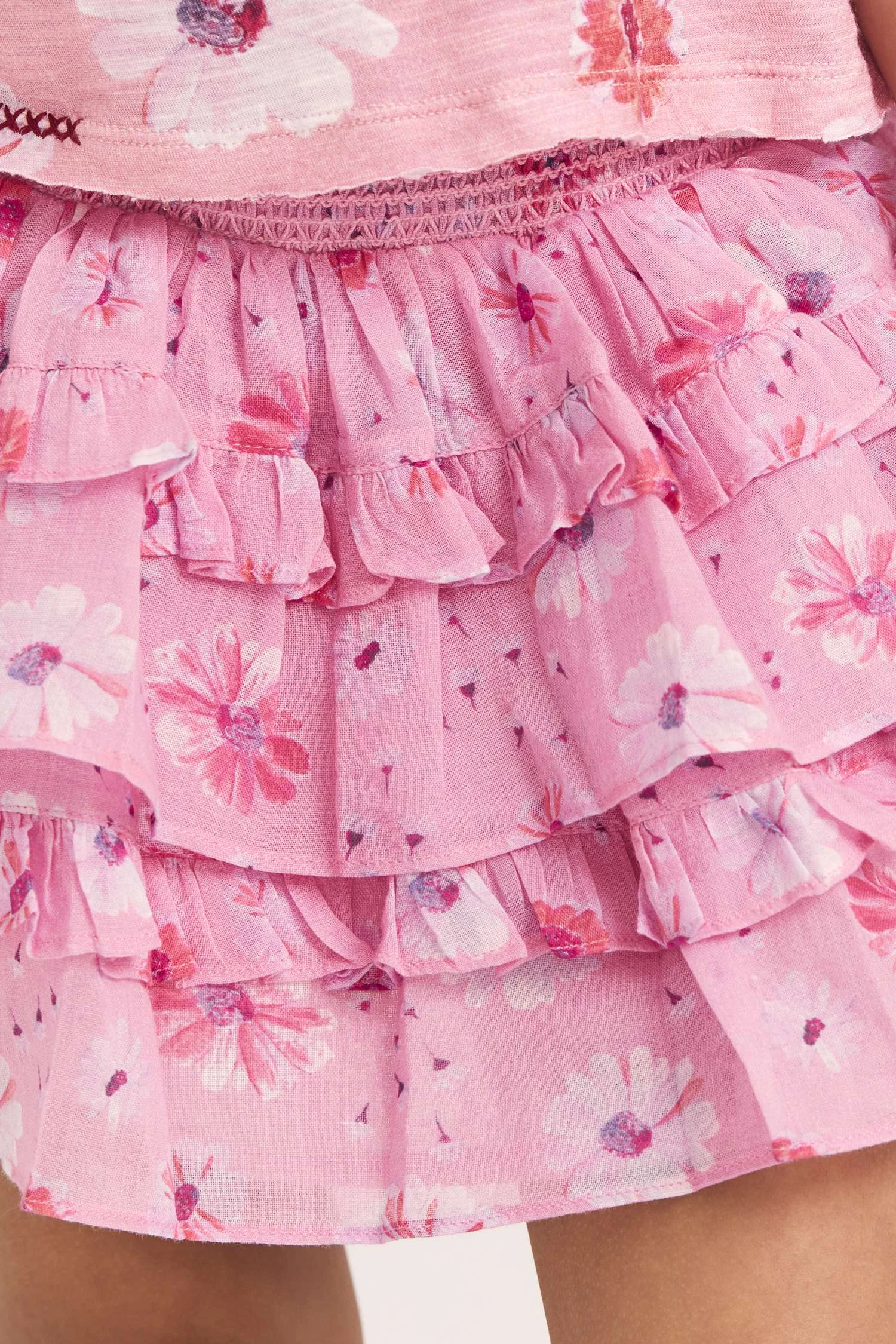 Our Billie Skirt is reimagined in 100% cotton voile with a tossed daisy print. Below a wide smocked waistband, the skirt falls to two shirred tiers with ruffle details. Wear it with our Girls Mini Calix Tee. Shown here in Coral Blaze.