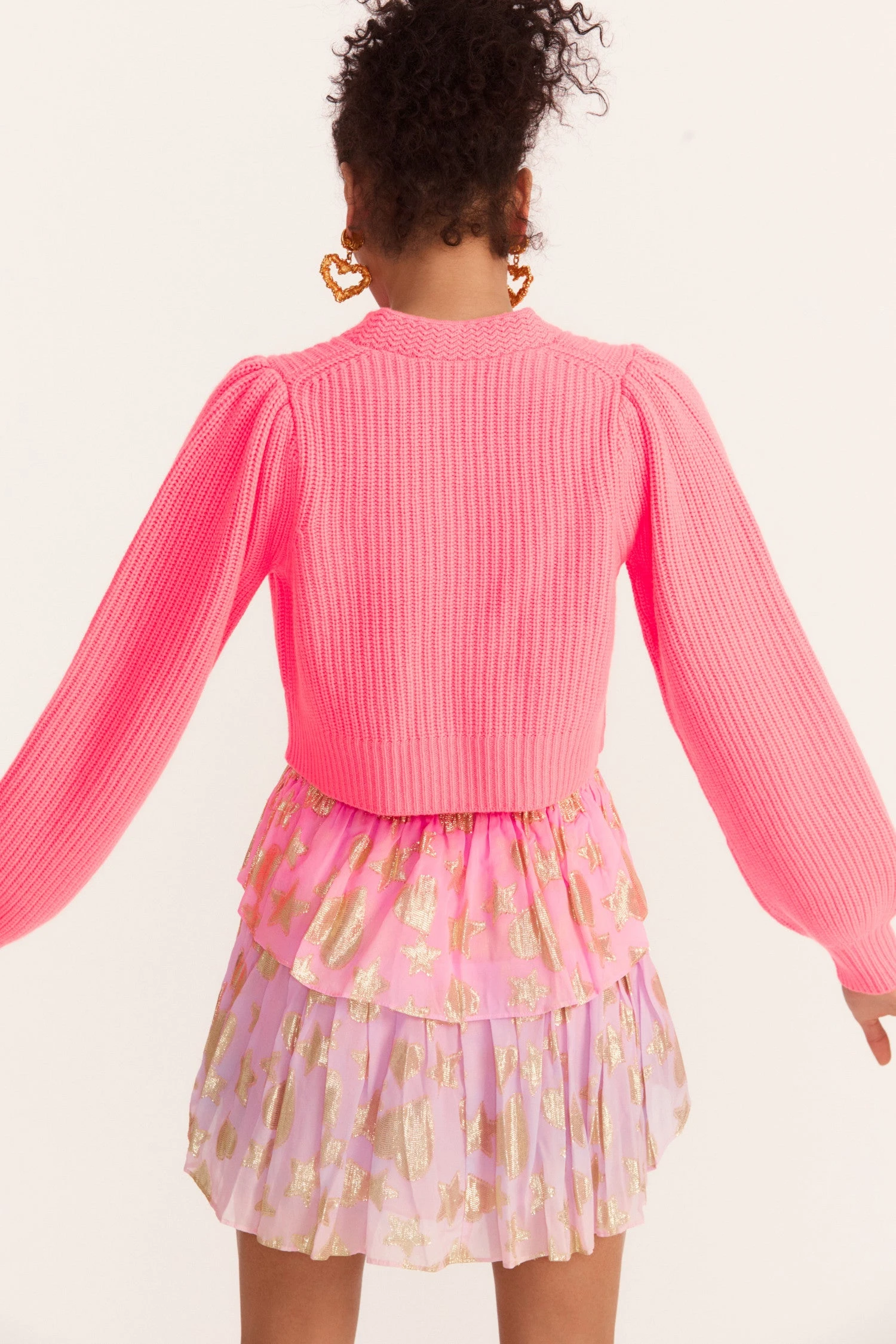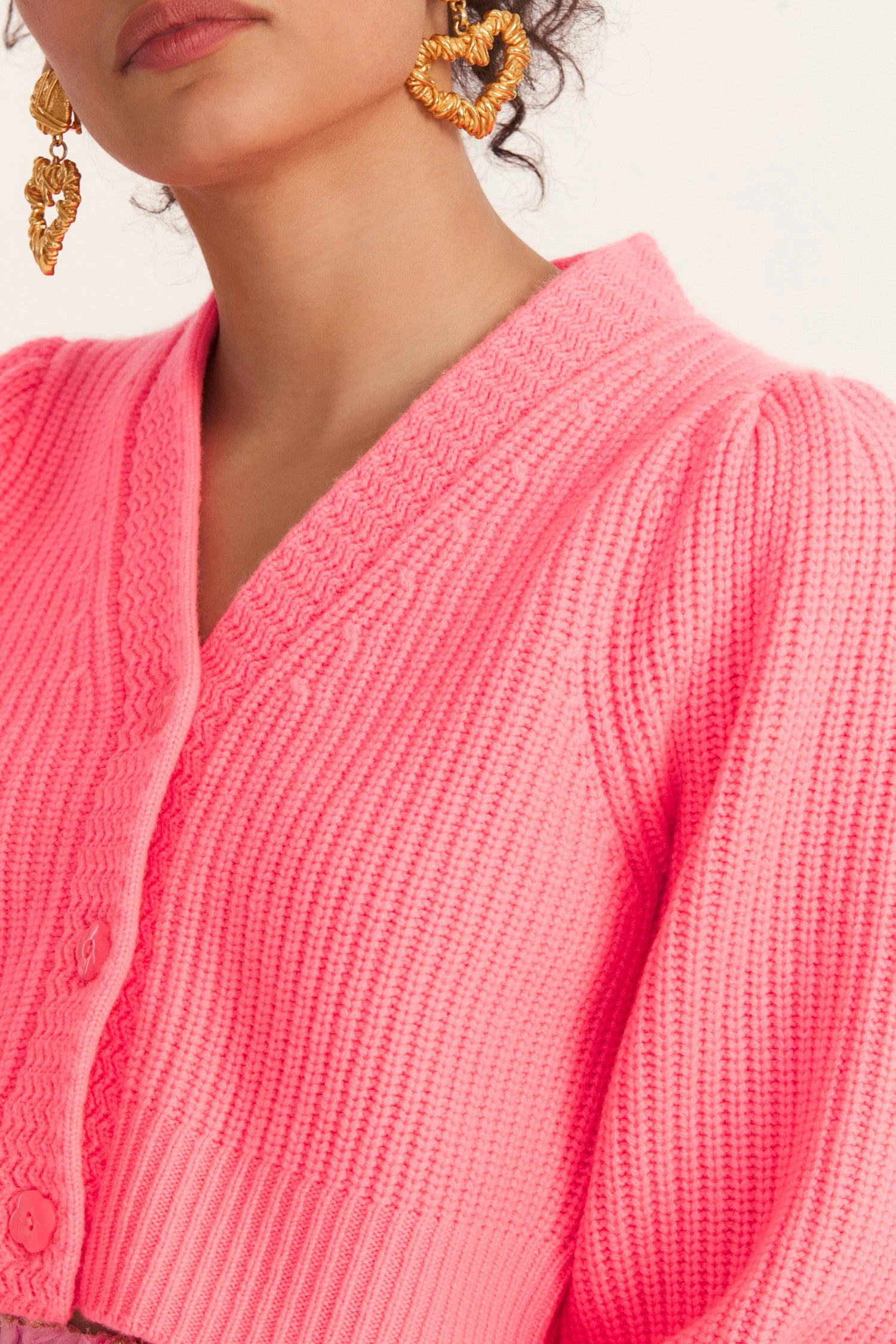 A signature favorite, our Avignon Cardigan is back in a cashmere-wool blend with intricate knit techniques. This cropped sweater, at once cozy and cute, has a v-neck that descends to three flower buttons at center front. Pleated blouson sleeves extend to ribbed cuffs at opening (mirrored at the bottom).ย