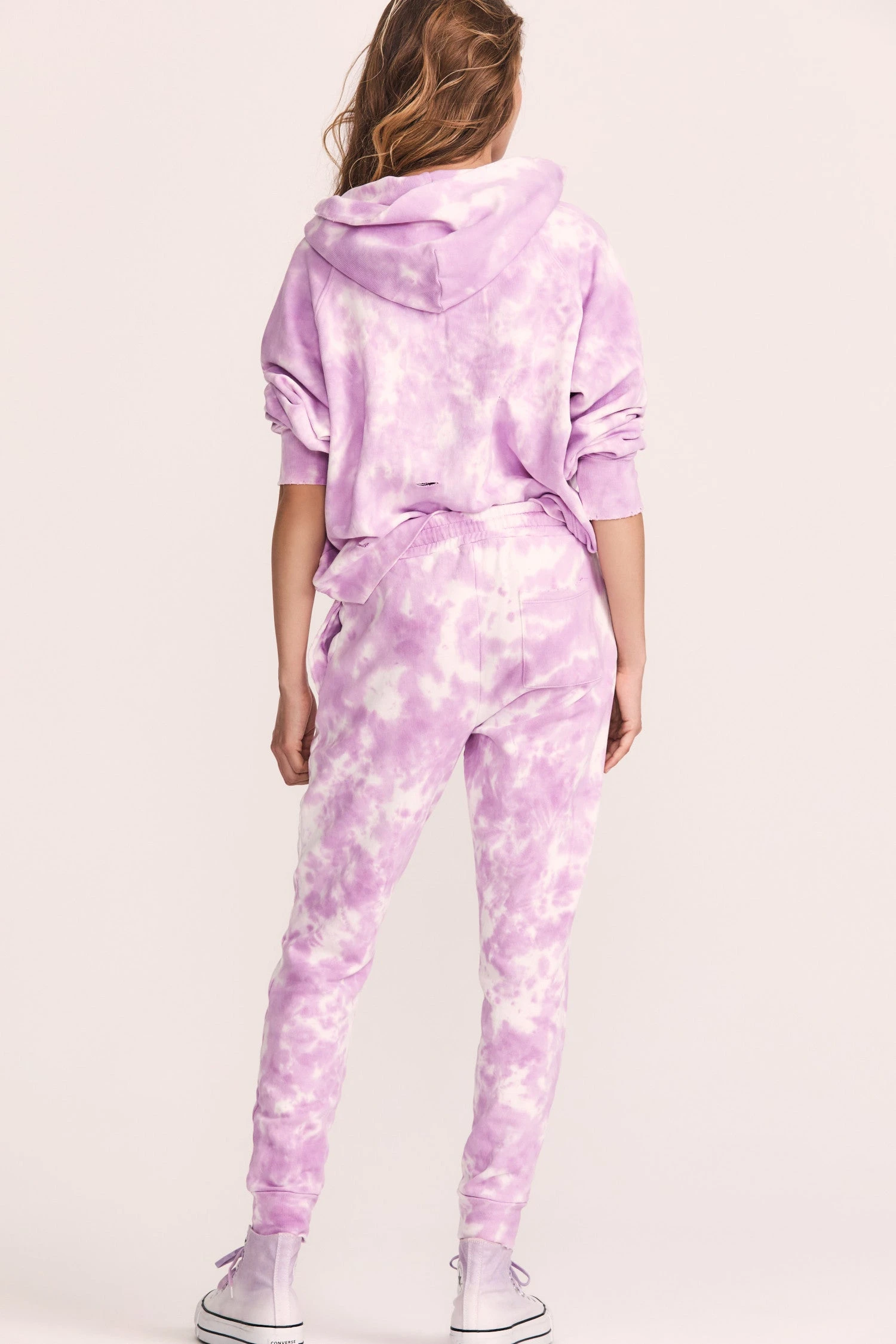 Meet our Yolanda Pant, luxuriously soft in hand tie-dyed terry cotton. This relaxed, cozy jogger has a functional drawcord at the elastic-encased waist with patch stitching details and distressing throughout.ย