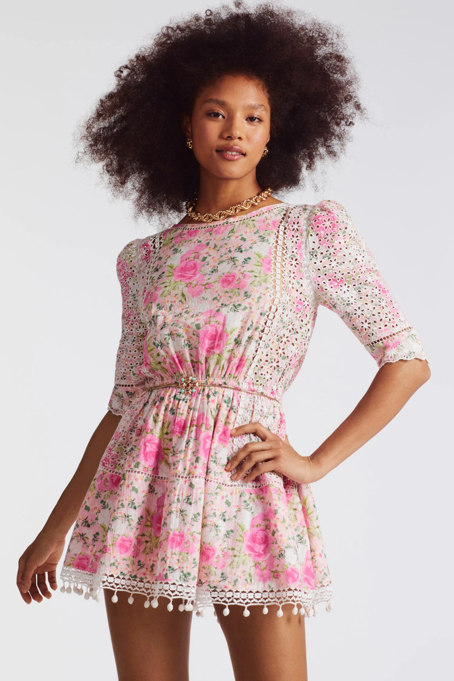 Meet our Novalie Dress in 100% cotton with contrast schiffli embroidery, inset lace panels and a hand-painted custom rose print. This day-to-night frock has a subtle scoop neck, intricate side panels and mutton elbow sleeves with scalloped trim. Below an elastic waist, the a-line miniskirt flares to a lace and bobble trim. Hook-and-eye closure at center back. Shown here in Magenta Flower Fields.