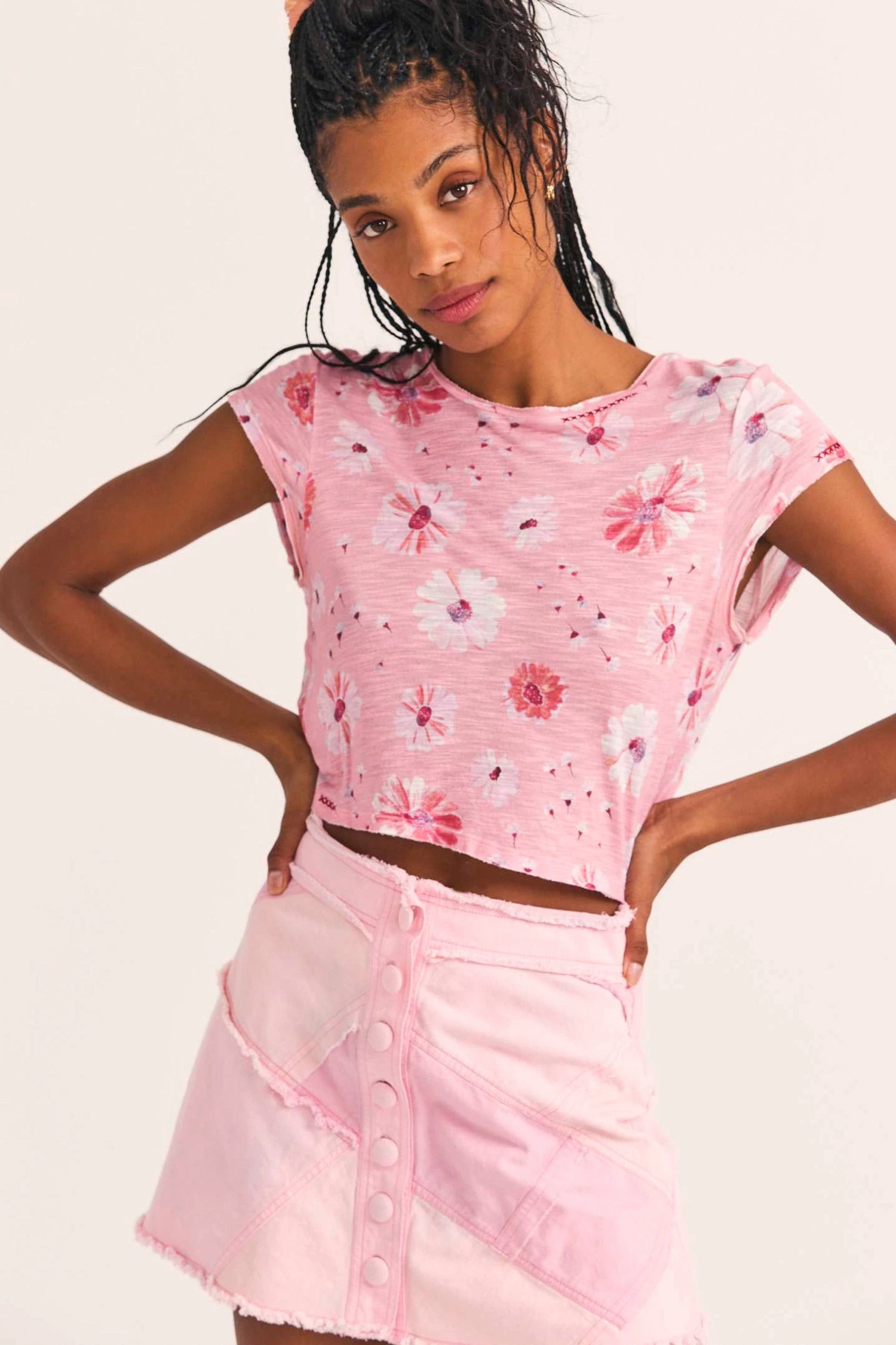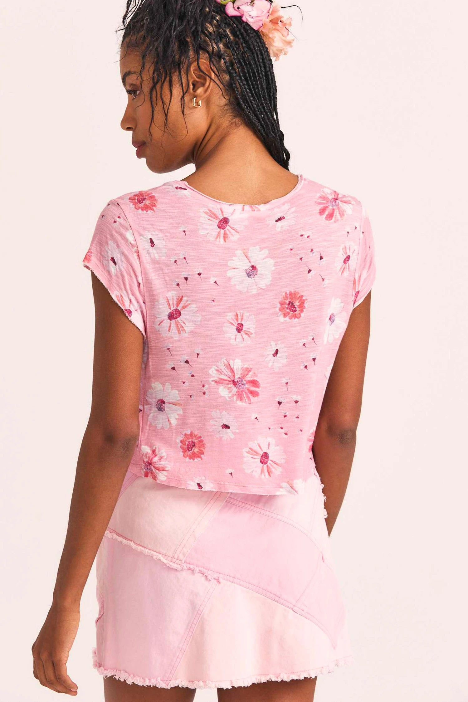 Our favorite Rubin Tee returns in our popular 100% cotton voile slub fabric with a tossed daisy print. This muscle tee has subtle stitching details at the loose circle neck and left cap sleeve and mildly distressed edges. Pair it with our Cayde Mini Skirt. Shown here in Coral Blaze.