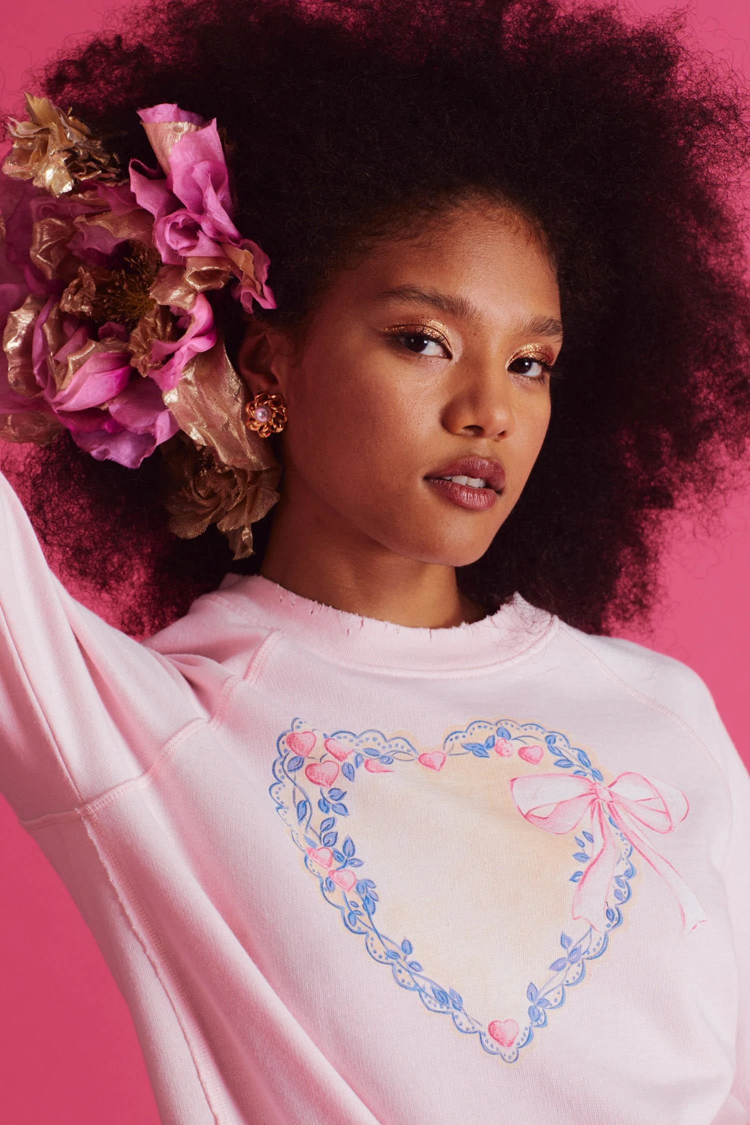 Tis the season for our vintage-inspired Ameenah Pullover in super soft washed cotton with distressed edges. This instant favorite holiday sweatshirt, perfect for yourself or as a gift, features a classic shrunken crewneck silhouette with raglan sleeves, subtly ribbed borders and a festive painted ornament graphic at center front. Wear it with our Dornie Leather Skirt. Shown here in Golden Locket Ballerina.