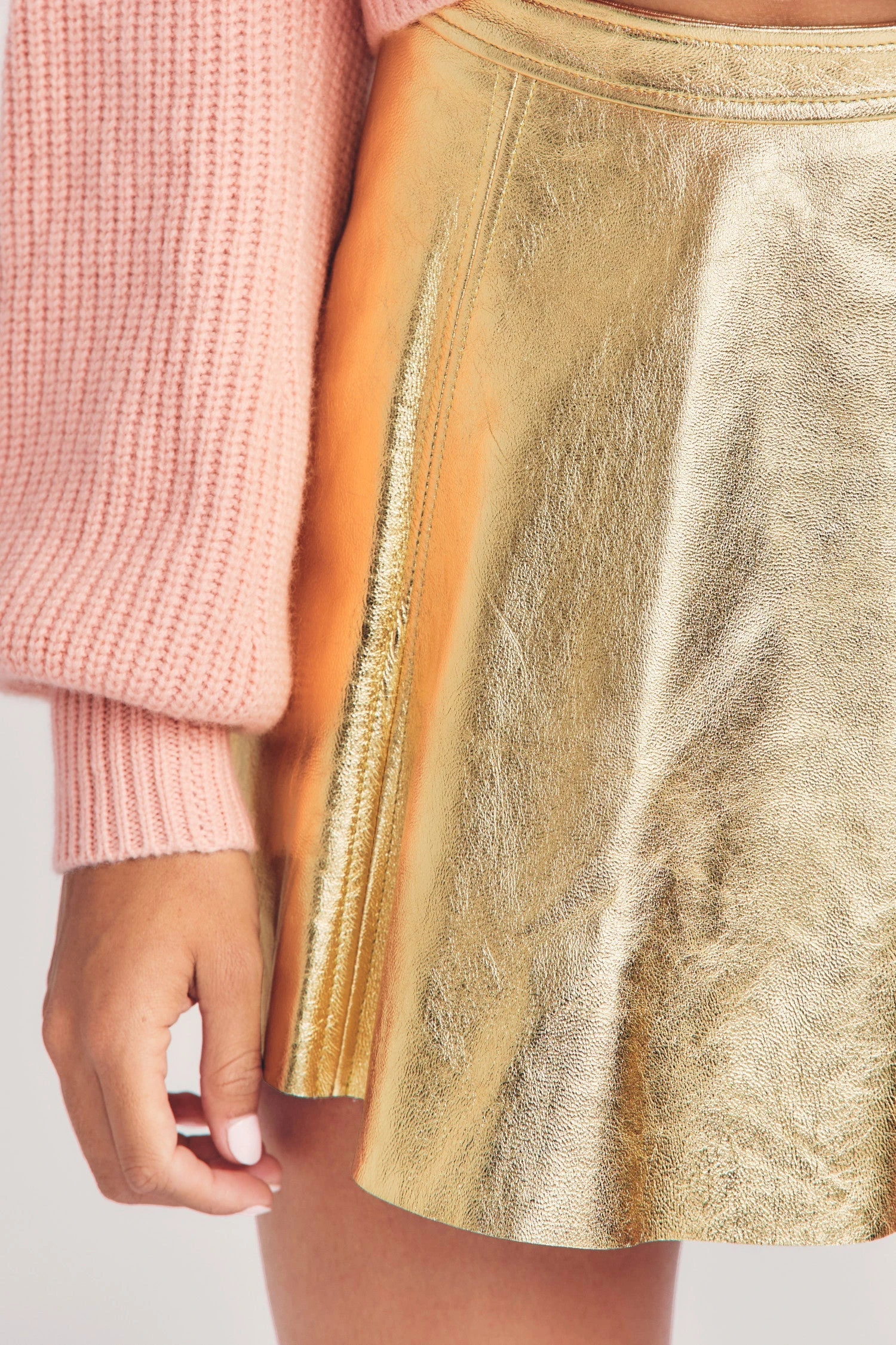 Our new Dornie Skirt is deeply covetable in shiny metallic leather. This a-line miniskirt has a fixed waist, princess seam details and a raw-edged hem. Wear it with our Robinson Cropped Cardigan.