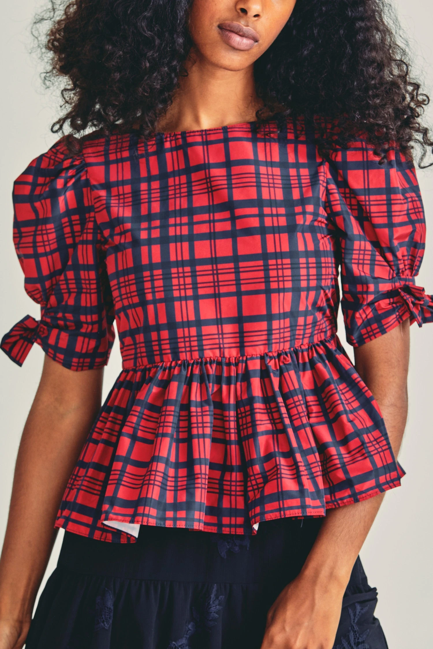 Our Keily Top is the icing on the cake in taffeta with a felt heart motif. This polished blouse has a circle neck (scooped lower at back), a center back zipper, proper puffed sleeves with bow details at the outer edge and an empire waist with a flounce at bottom. Shown here in Moody Ruby.