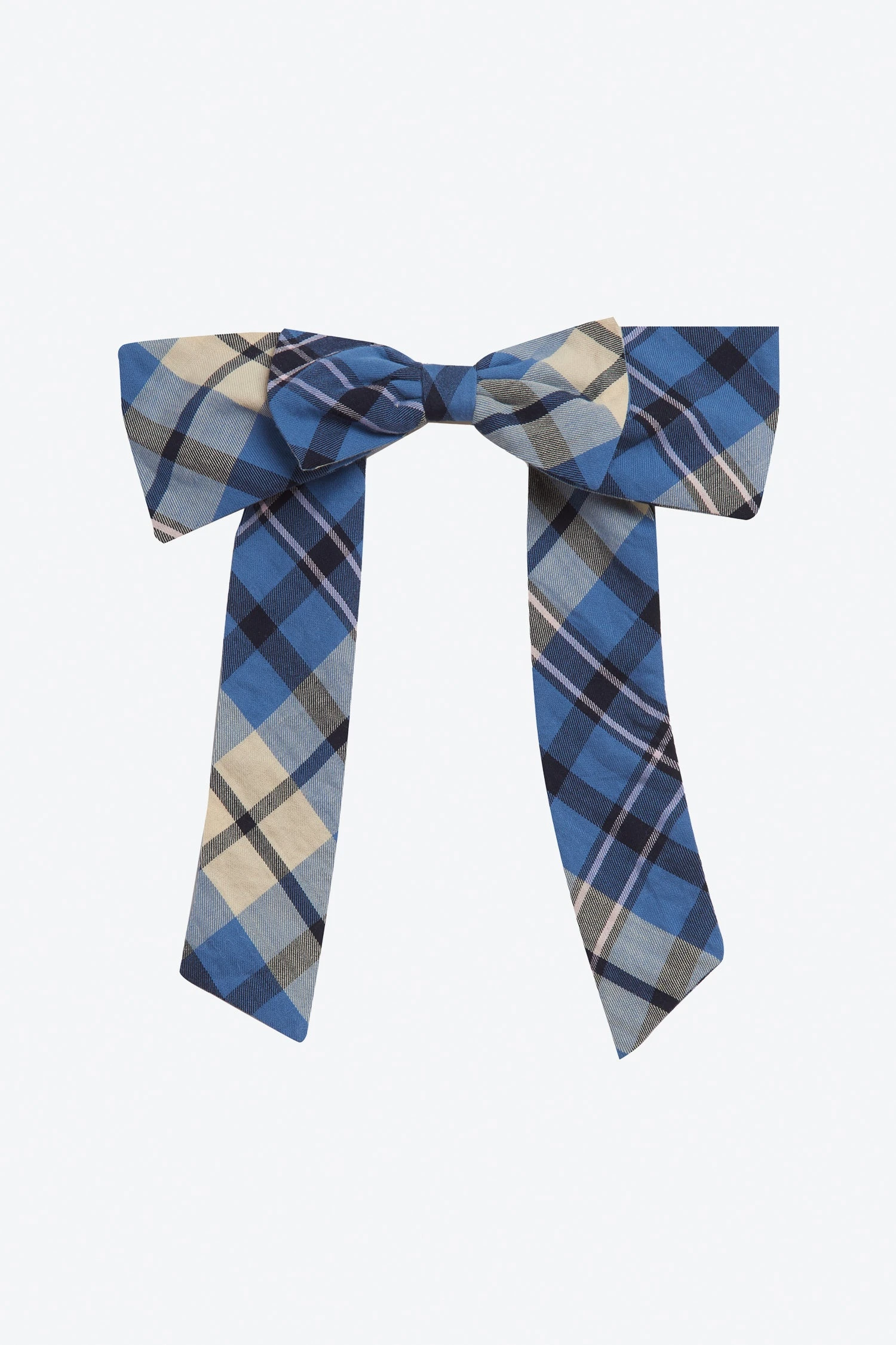 Our Lorna Barrette adds a girlish twist in cotton with a custom plaid print and a gold clip. This classic barrette features a smaller bow layered atop a larger one with diagonally cut ribbon peeking from beneath. Pair it with our Carsona Dress. Shown here in Denim Skies.