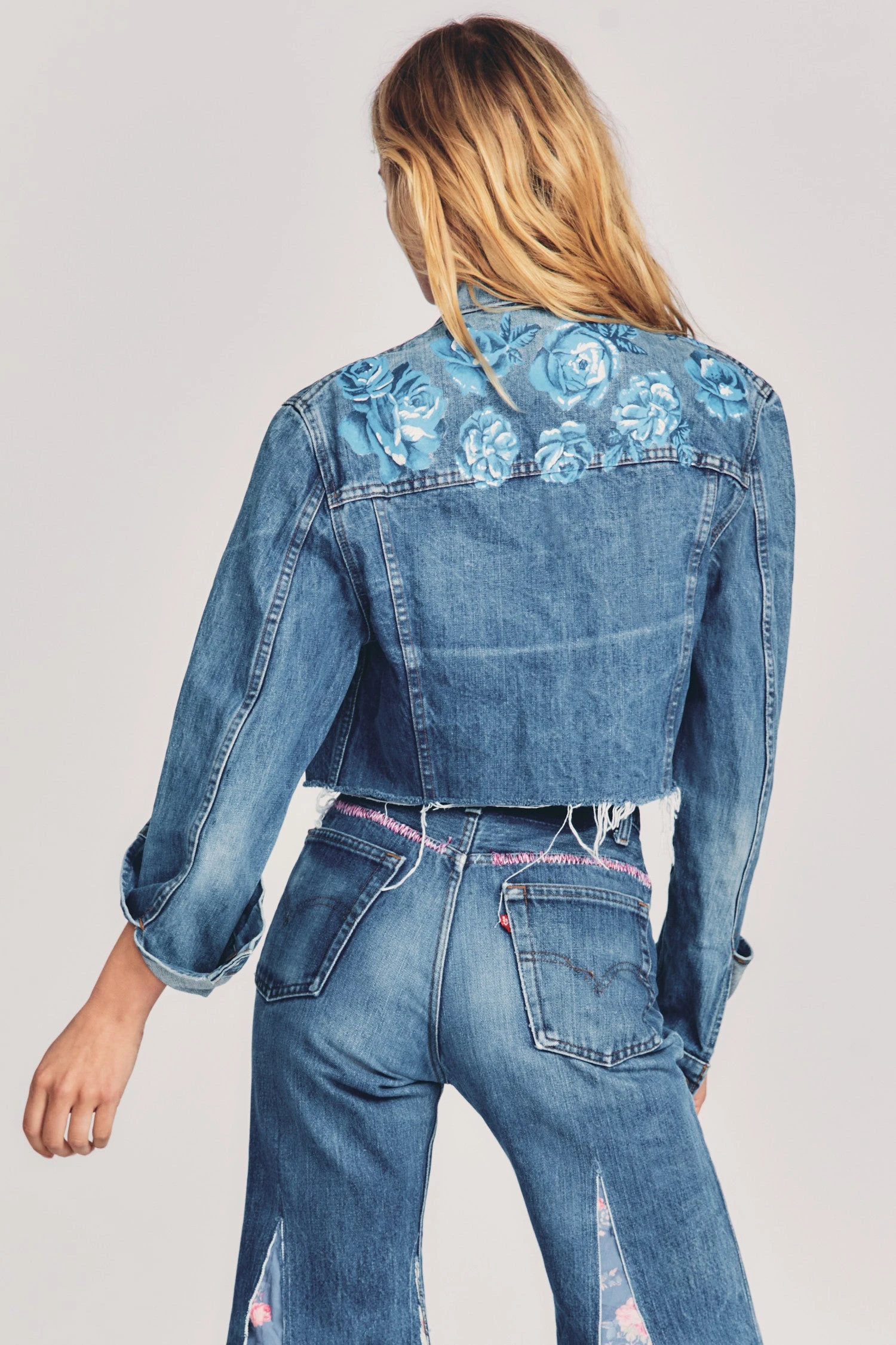 Our new LoveShackFancy x Rialto Jean Project exclusive denim jackets are individually sourced and upcycled with hand-painted floral motif adorning front and back. This one-of-a-kind cropped jean jacket features metal buttons down center front, patch pockets and distressed raw-edge hem. Pair it with our LoveShackFancy x Rialto Floral Flare Jeans. Shown here in Denim.