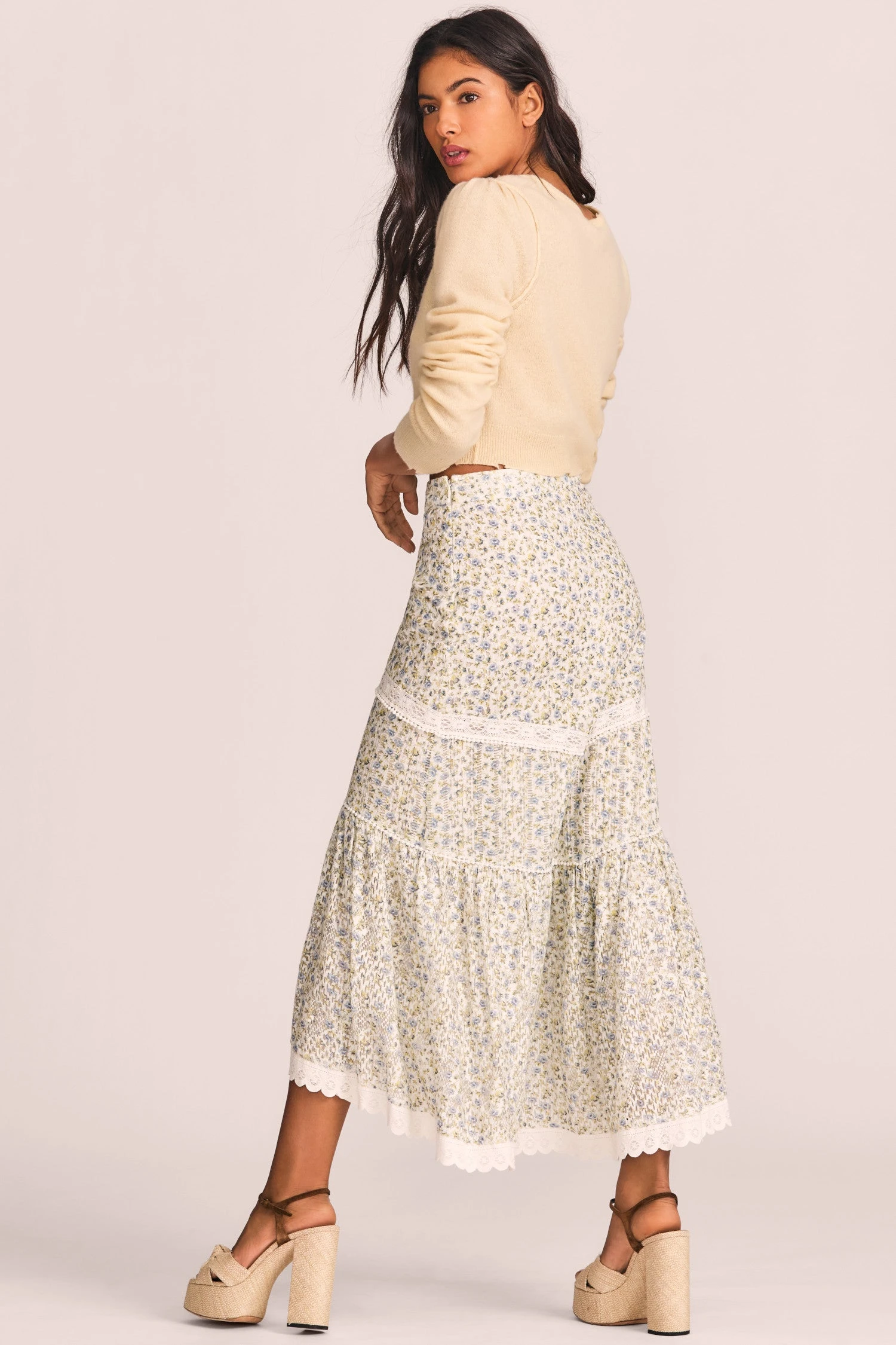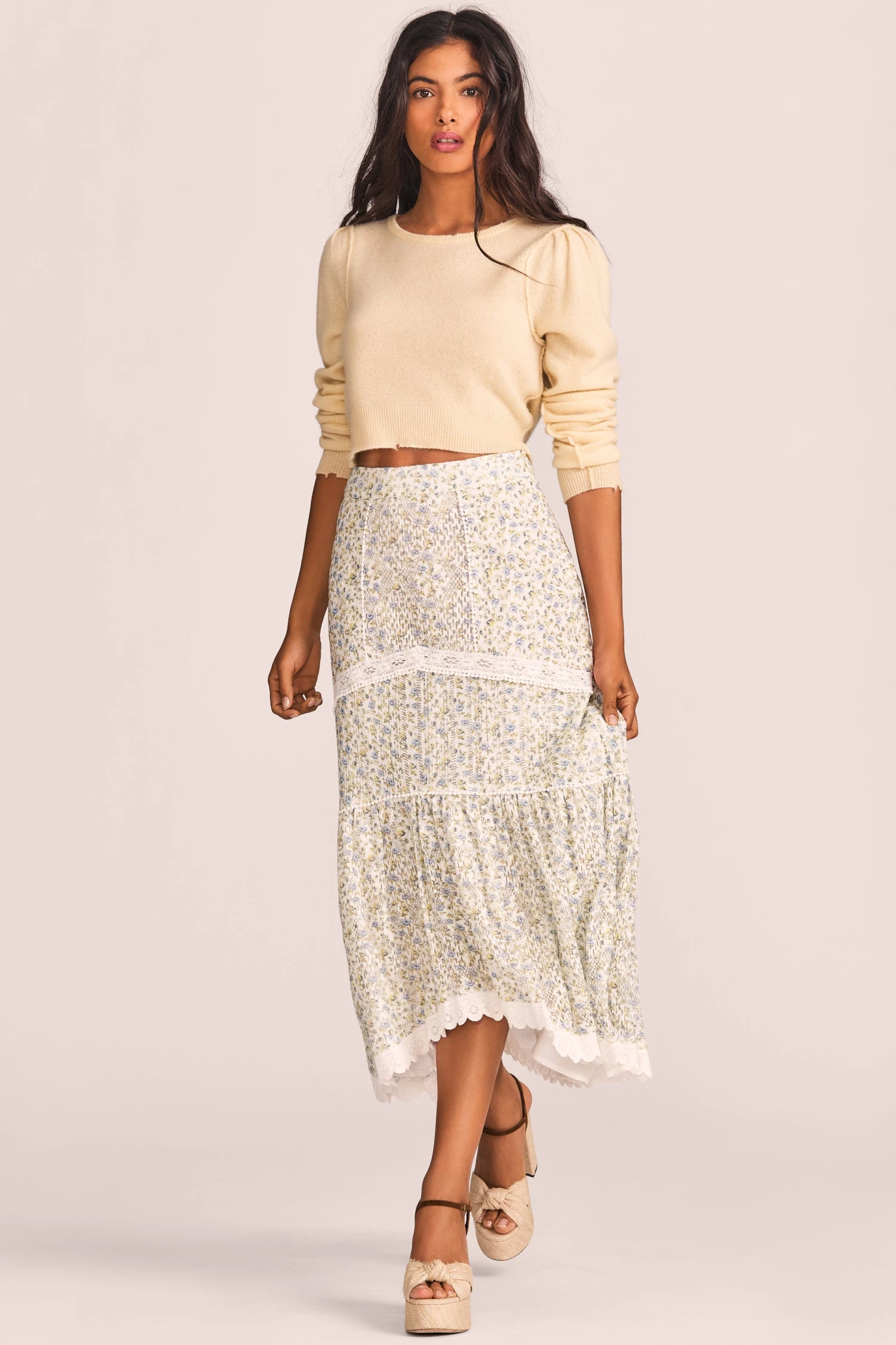 A favorite this season, our Sisto Skirt debuts in a mix of all-over custom lace and eyelet fabrics with a ditsy rosebud print and lace and bobble trim. This flowing skirt has a fixed waist, a slim fit, pompoms down the princess seams and a high-low flare at bottom, longer at back. Wear this with our Lune Crop Pullover. Shown here in White Garden Stream.