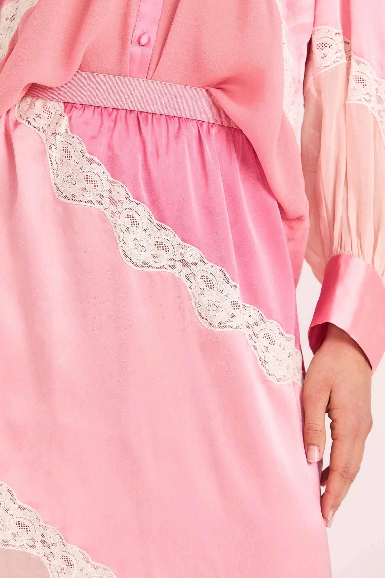 It’s pink FTW in our new Marten Skirt with diagonal color-blocking and custom scalloped lace details. This silky midi-skirt features a fixed waistband, shirring at top, a slim fit and a handkerchief hem. Pair it with our Zavia Blouse. Shown here in Pastel Pink Colorblock.