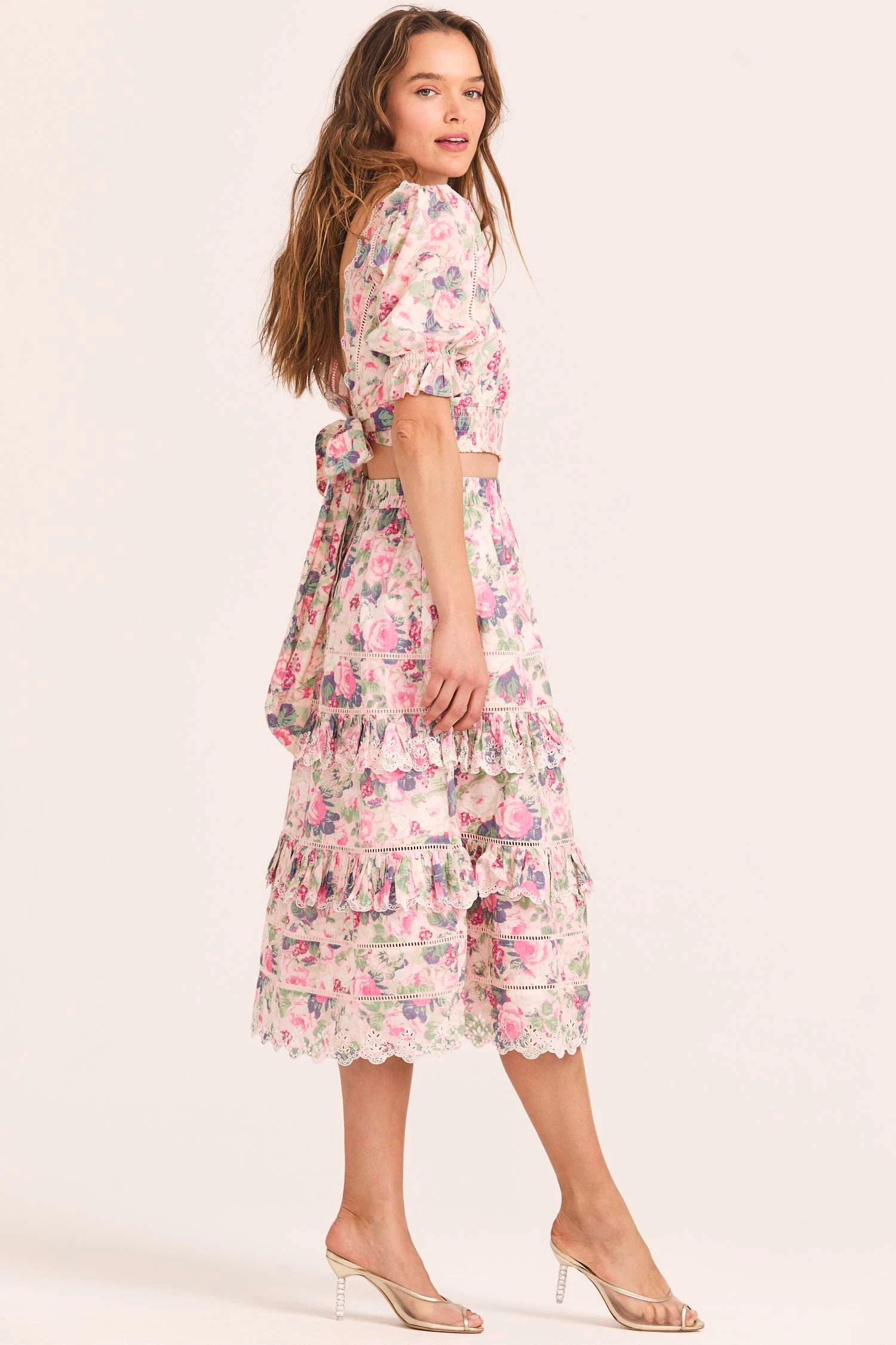 Our Naila Skirt sweeps in with our hero hand-painted rose print of the season, inset embroidery and eyelet detailing. This midi-length piece is 100% cotton, has an elastic waistband and side-seam pockets and drapes to a full sweep with alternating details between eyelet trimmed flounces. Wear it as a set with our Karsten Crop Top. Shown here in Veiled Kiss.