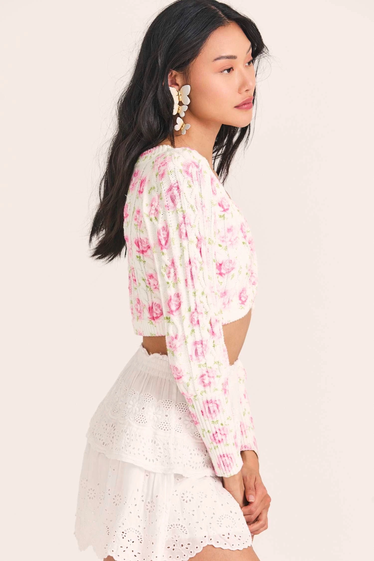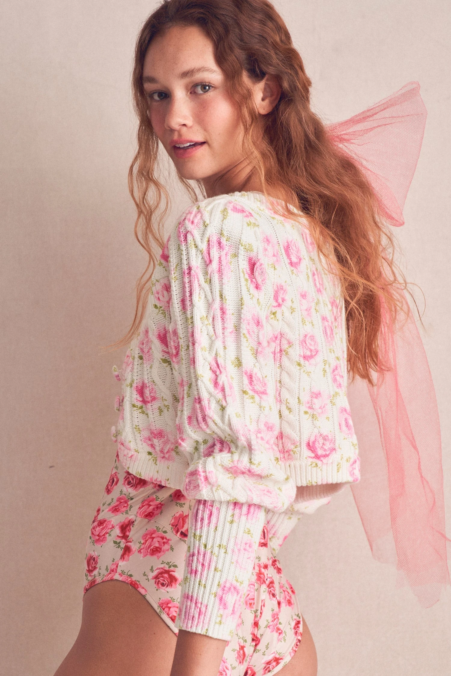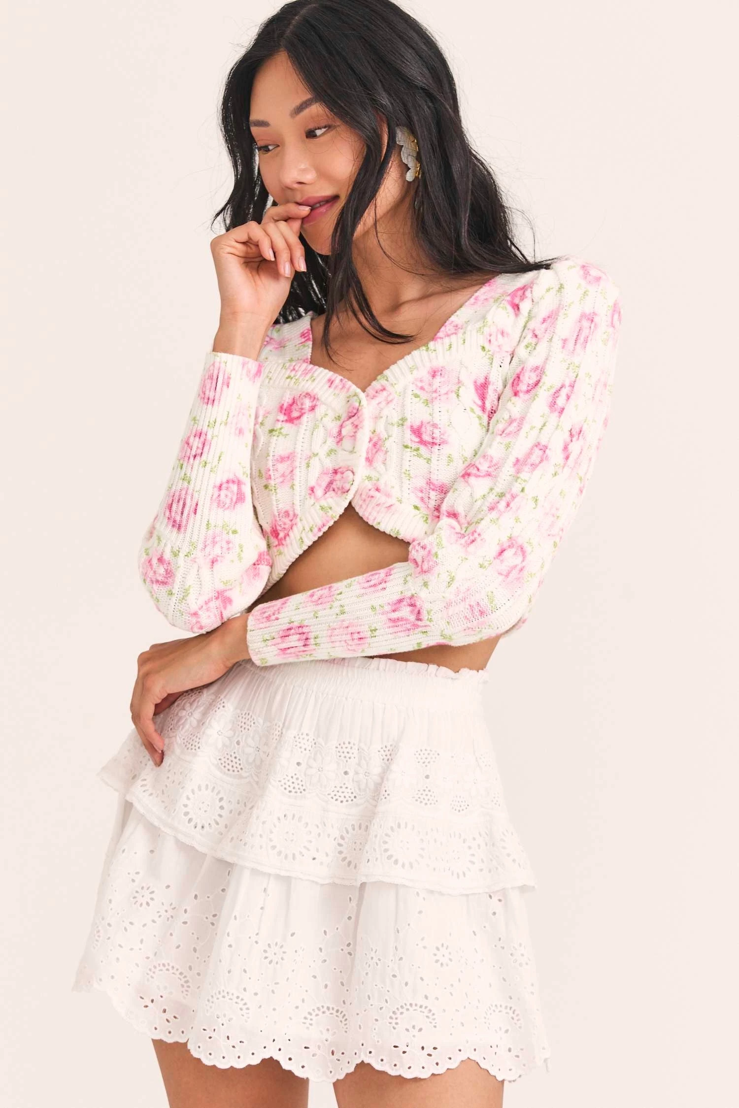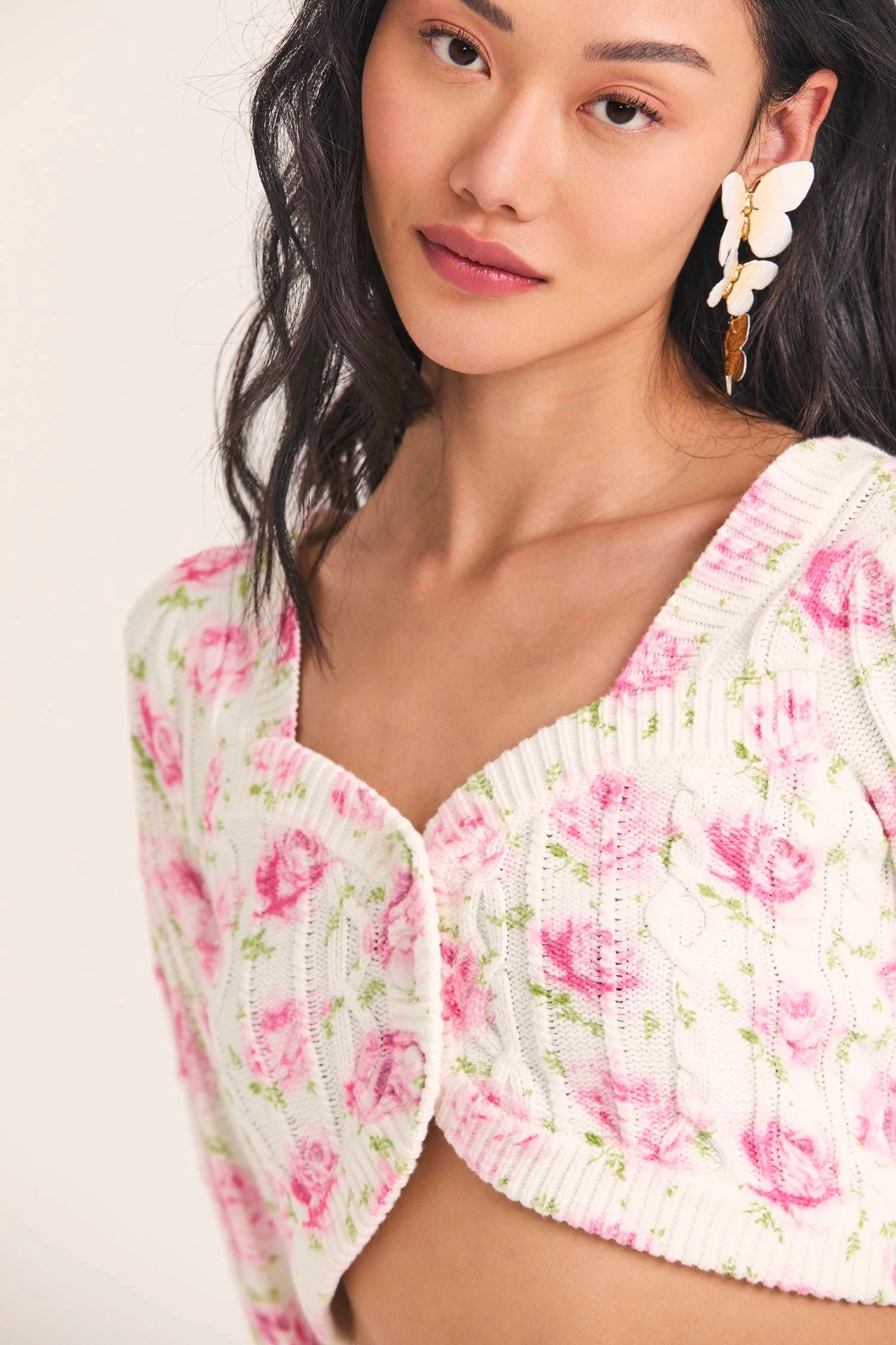 Our Bishop Crop Cardigan is brand new in 100% cotton with a classic rose print and a mix of vertical cable knit and lofty rope stitching. This short sweater is a perfect layering piece with a sweetheart neckline and overlapping ribbed trim, mirrored at bottom hem (which slopes longer at back). Subtle puffed sleeves finish with extra tall ribbed cuffs at opening. Pair it with our Charmaine Mini Skirt.