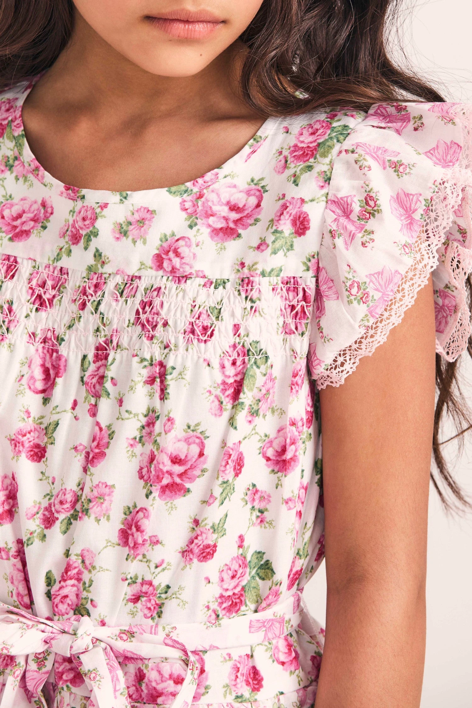 Meet our statement Garden Party Dress for girls with contrasting patterns including two different, charming rosebud prints and a lovely bow adorned print. This dress has a major Victorian-inspired high neck and custom lace adorned sleeves. Featuring a functional tie at the waist, the skirt flows into three separate, ruffle tiers. Dress your doll in the matching Garden Party Dress. Shown here in Blushing Bud Pink.