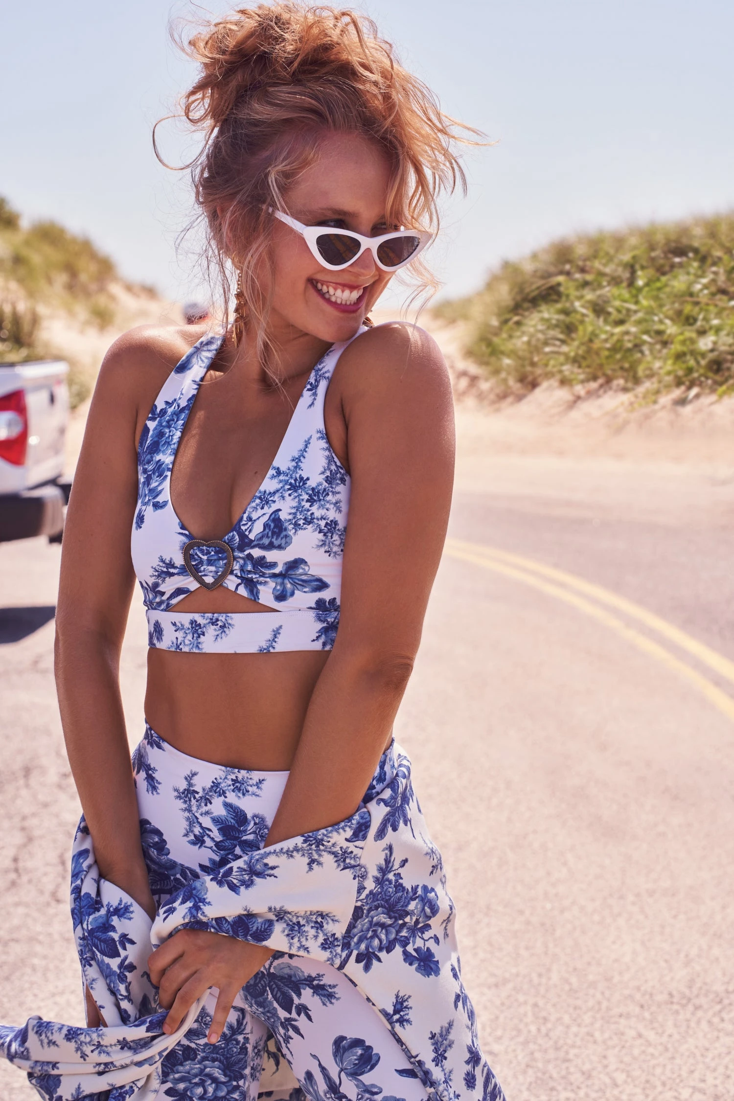 The Twist Top is our popular twisted racerback sports top. This top features a front twist detail with a peek-a-boo cutout above the band allowing your skin to peek through. Now available in the charming LoveShackFancy x Beach Riot Versailles Blue print. Pair this top with the matching Piper Legging for a head to toe look or mixรฅรit upรฅรwith our Dana Legging Shown here in Versailles Blue.