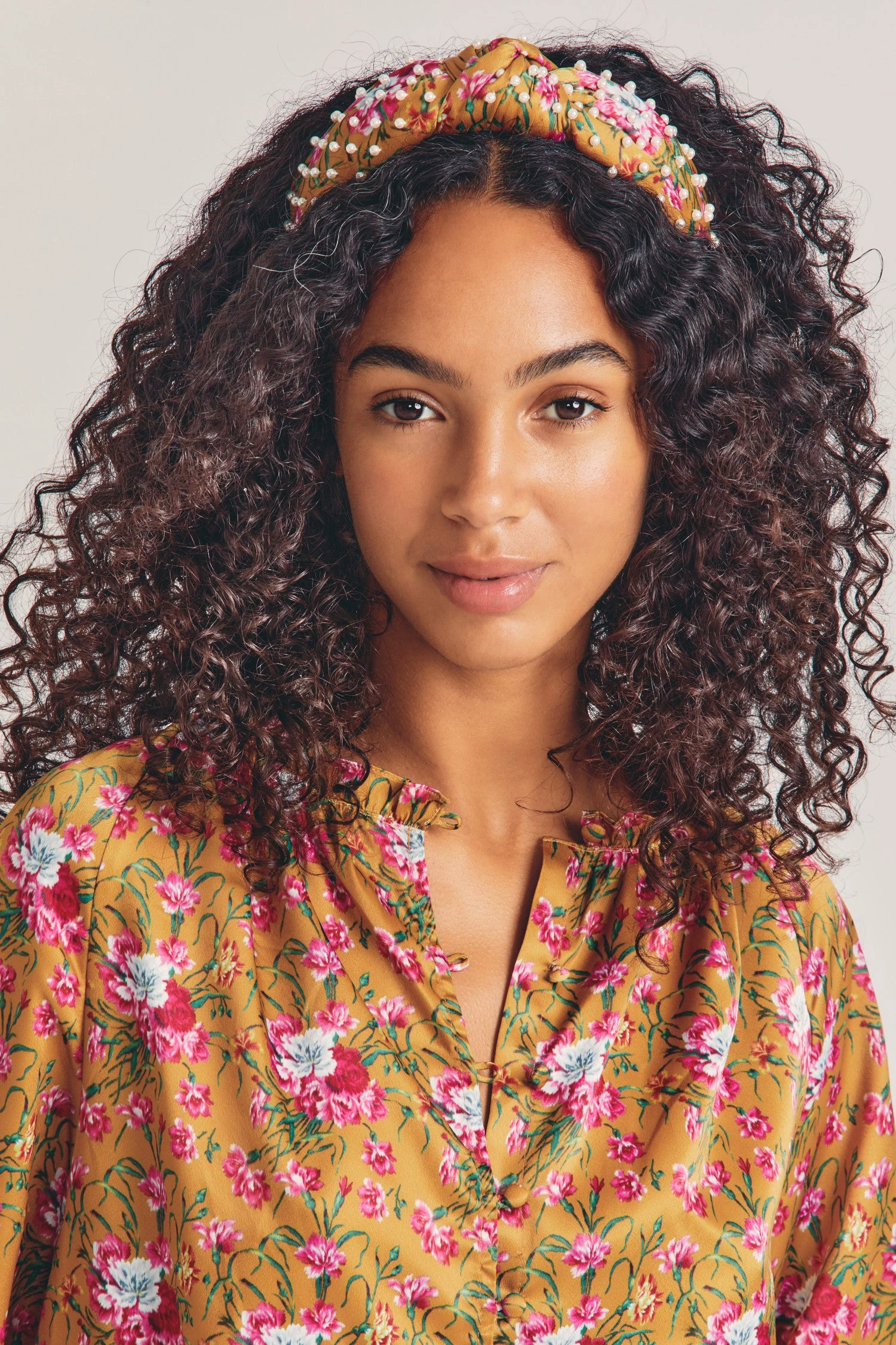 This season, our LoveShackFancy x Lele Sadoughi Knotted Headband returns in updated textiles. On this wide headband, material is hand-knotted over a 1″ tall comfort fit base with a 1 1/2″ knot and 2 1/4″ width. Arrives in a LoveShackFancy print dust bag. Wear it with our Manchester Blouse. Shown here in Ruby Goldmine.