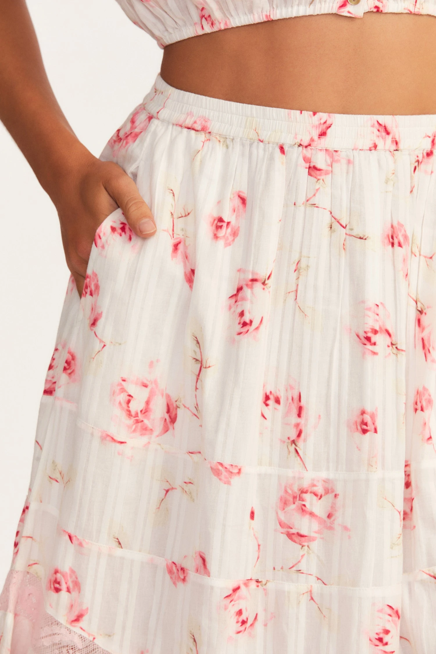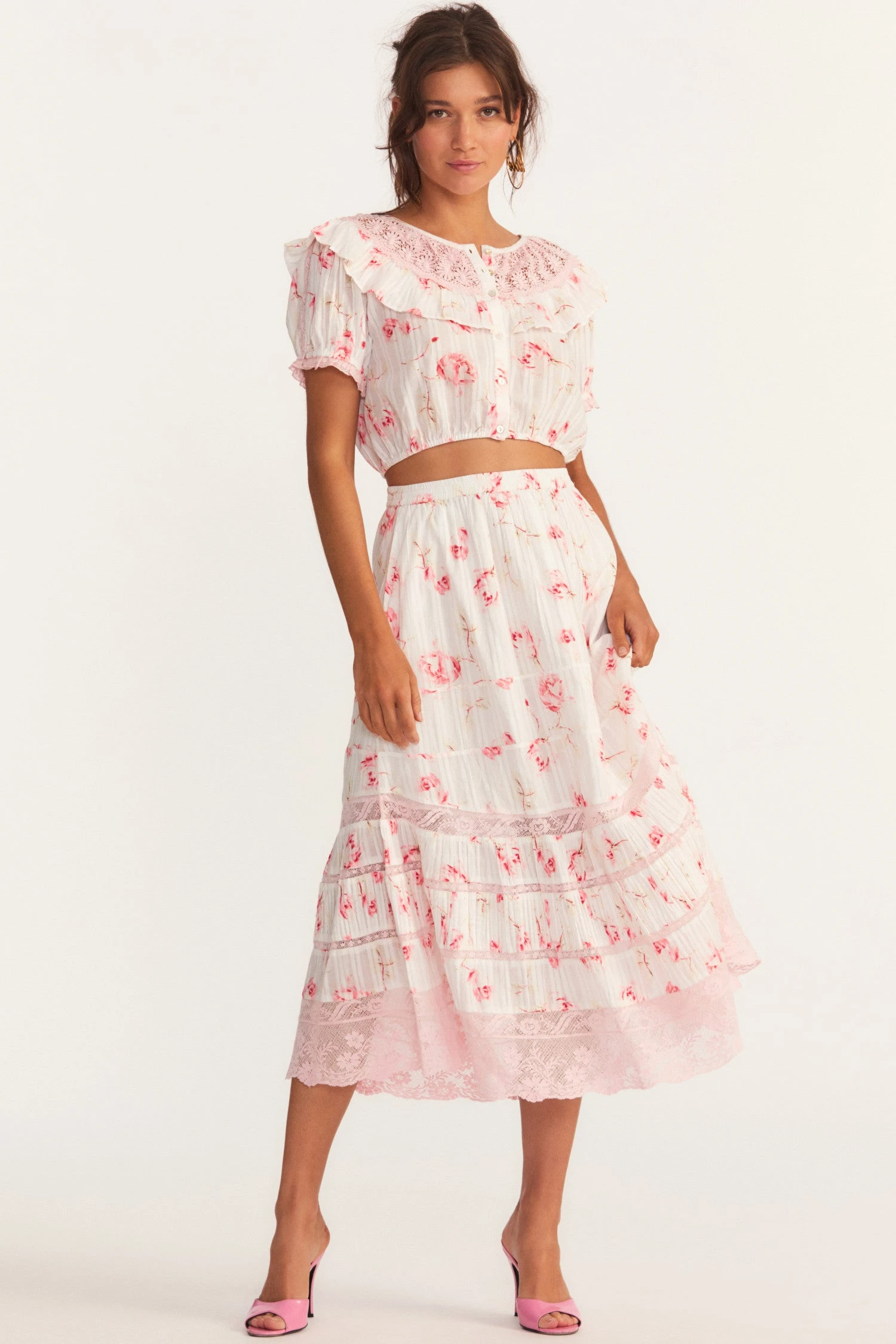 Introducing our darling Quill Skirt in cotton dabby with our hero rowboat print. This midi skirt shines with intricate custom lace detailing and features functional pockets at the front. Wear it as a set with our Elania Crop Top. Shown here in Cherry Soda.